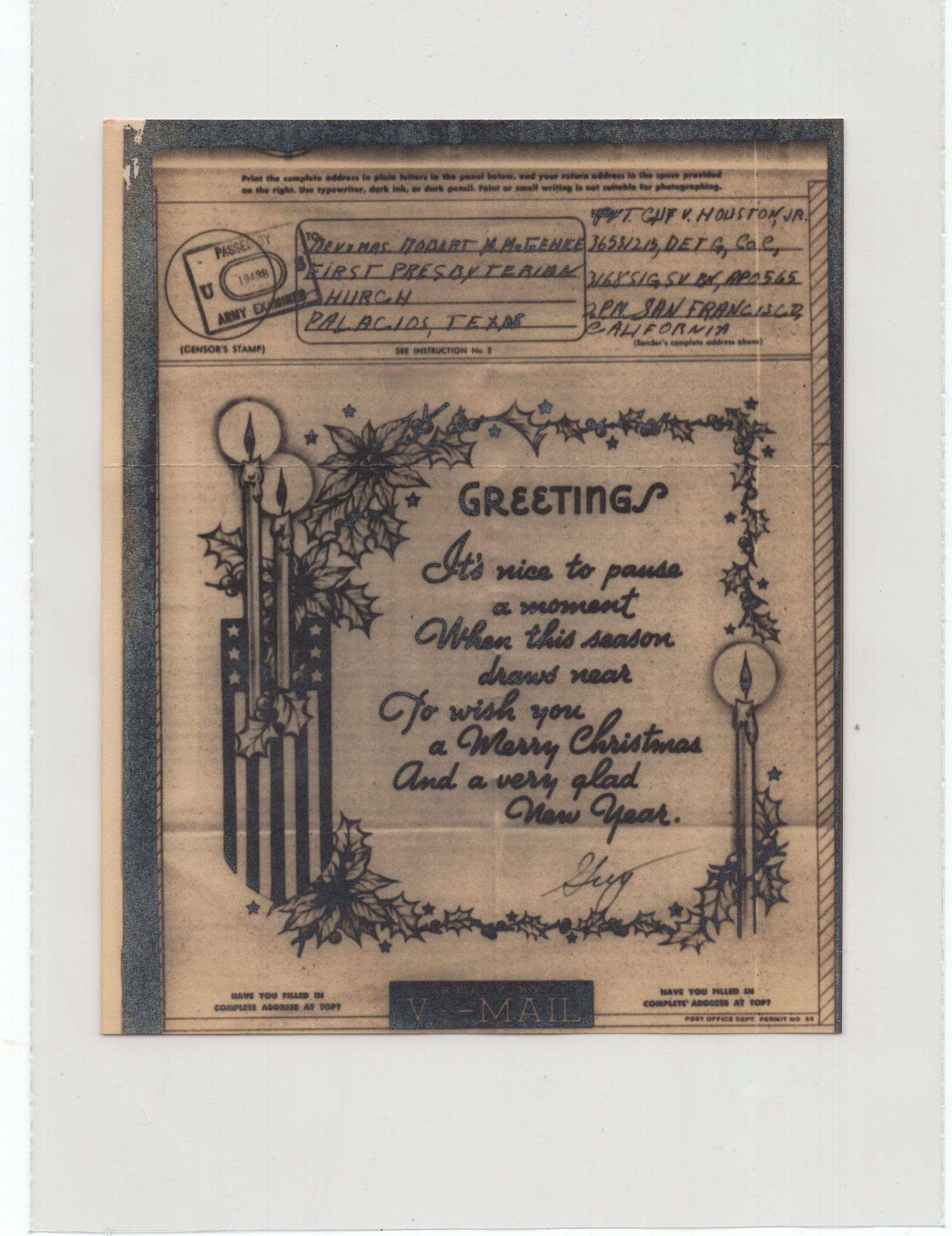 Small Paper Pvt Guy A. Houston to Rev & Mrs. Robert M. McGeheeTags