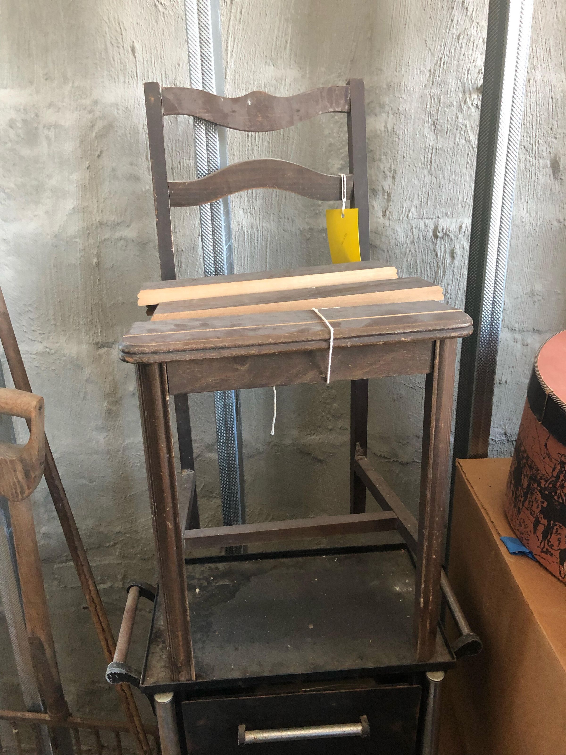 Small wooden chair from Robert Trant, some of the slates on the flat part of the chair have come loose and are sitting atop it