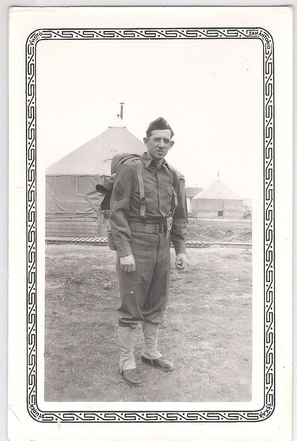 Photograph of a soldier standing in his uniform in front of a tent.