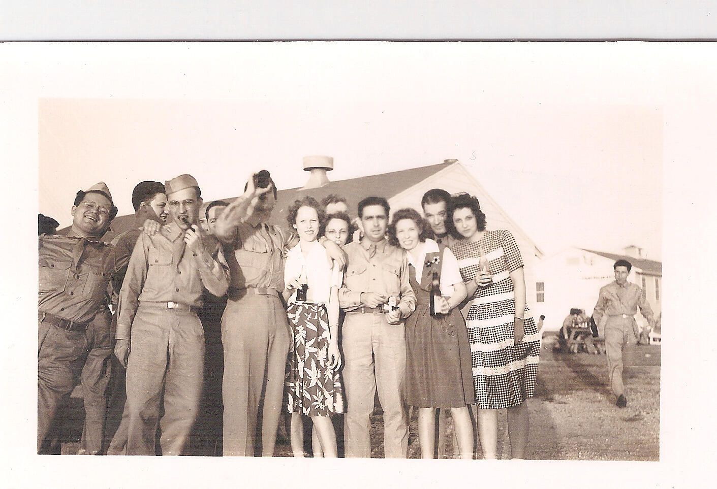 Photograph of soldiers and women enjoying drinks at Camp Hulen. All the soldiers are wearing their uniforms while the women are wearing dresses.