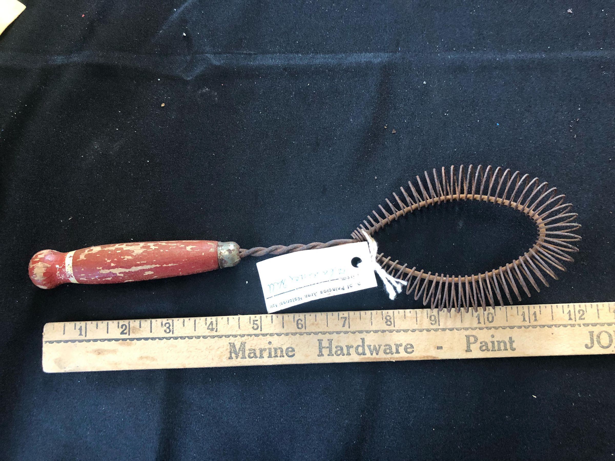Coiled metal around another circular metal piece stuck into a wooden handle with a spiraled metal stem