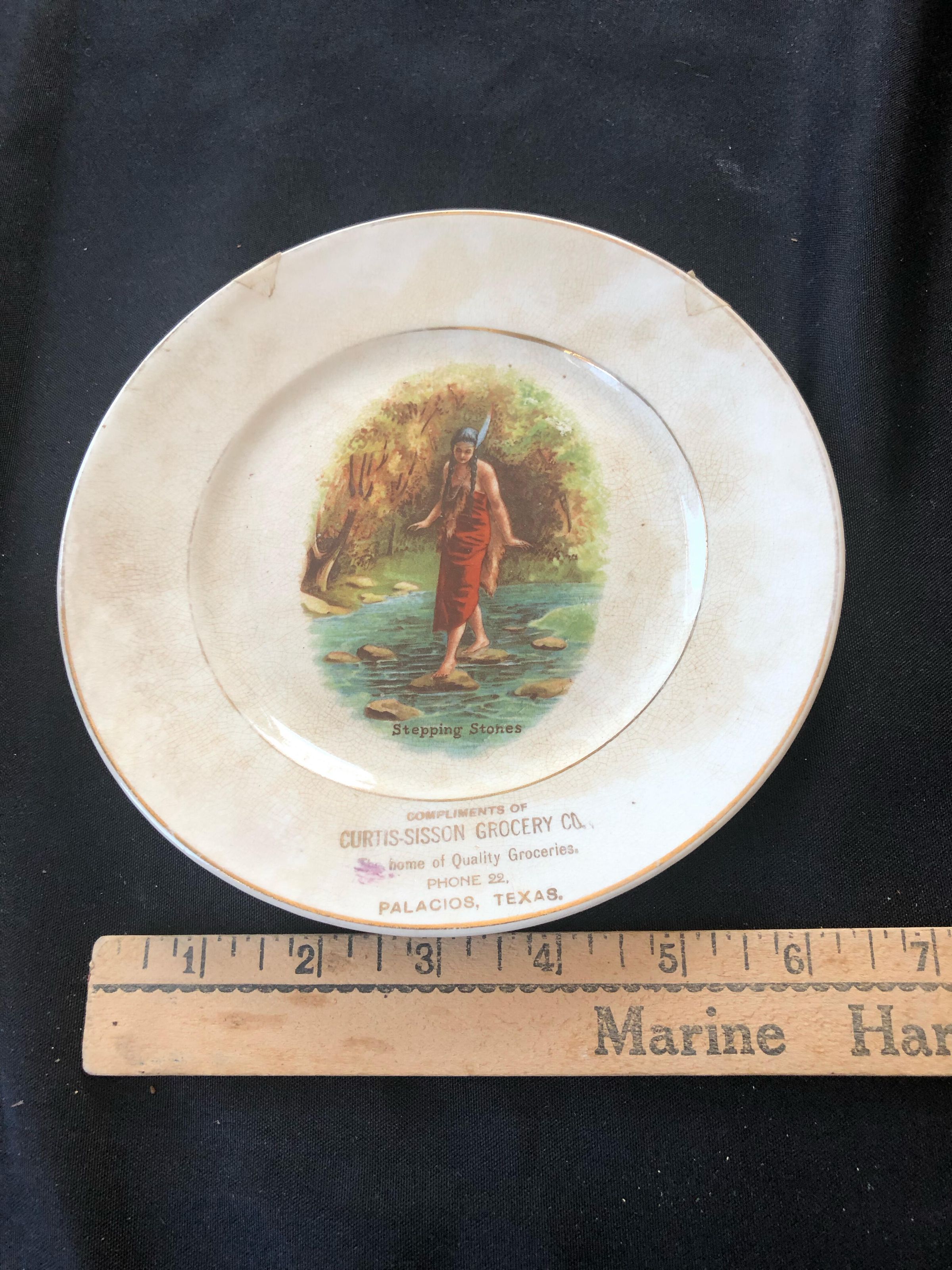 White plate with an Indigenous woman in the center who is walking on stones in a river