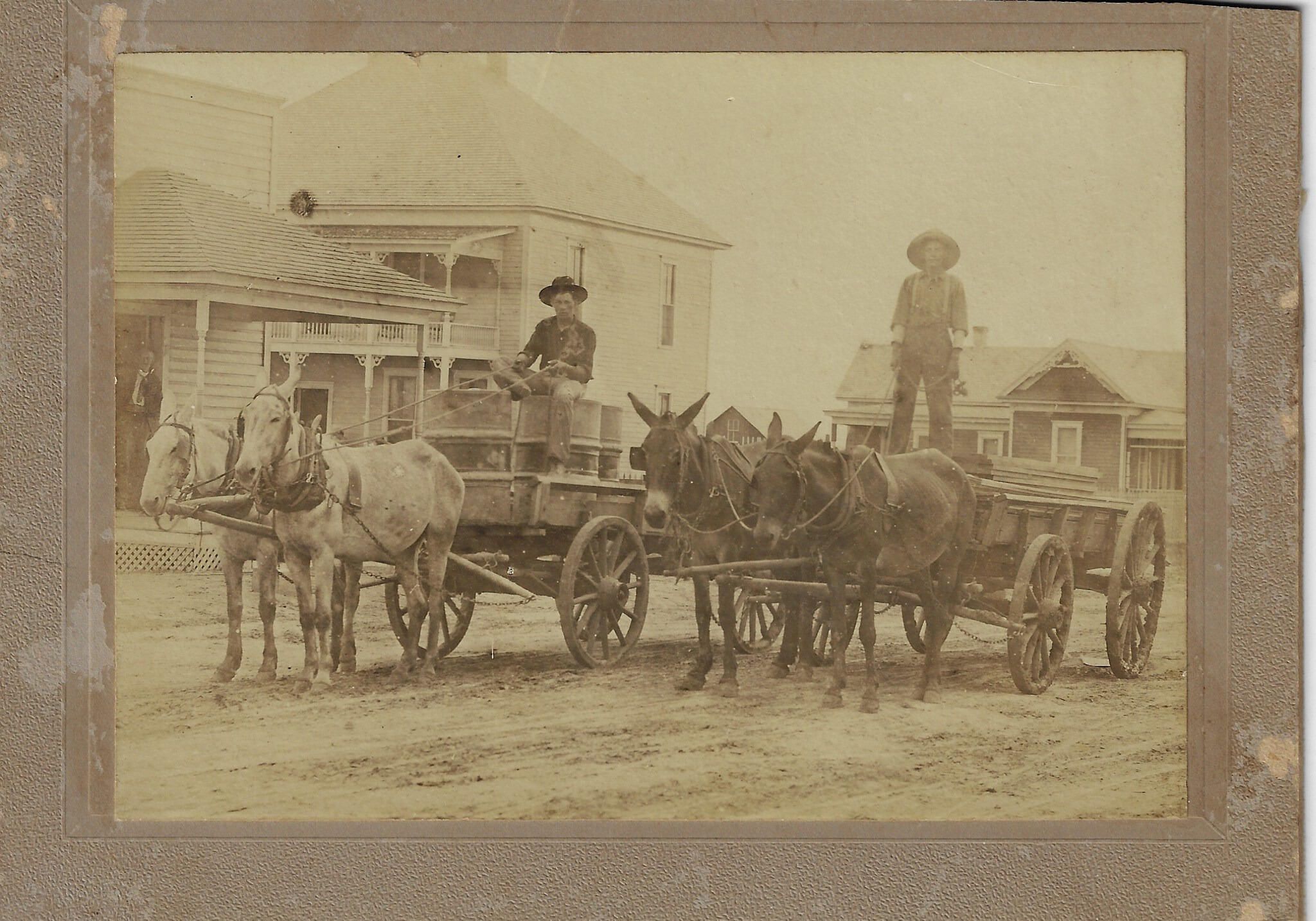 Cox house, Man on gasoline wagon and the other man on load of lumber.
