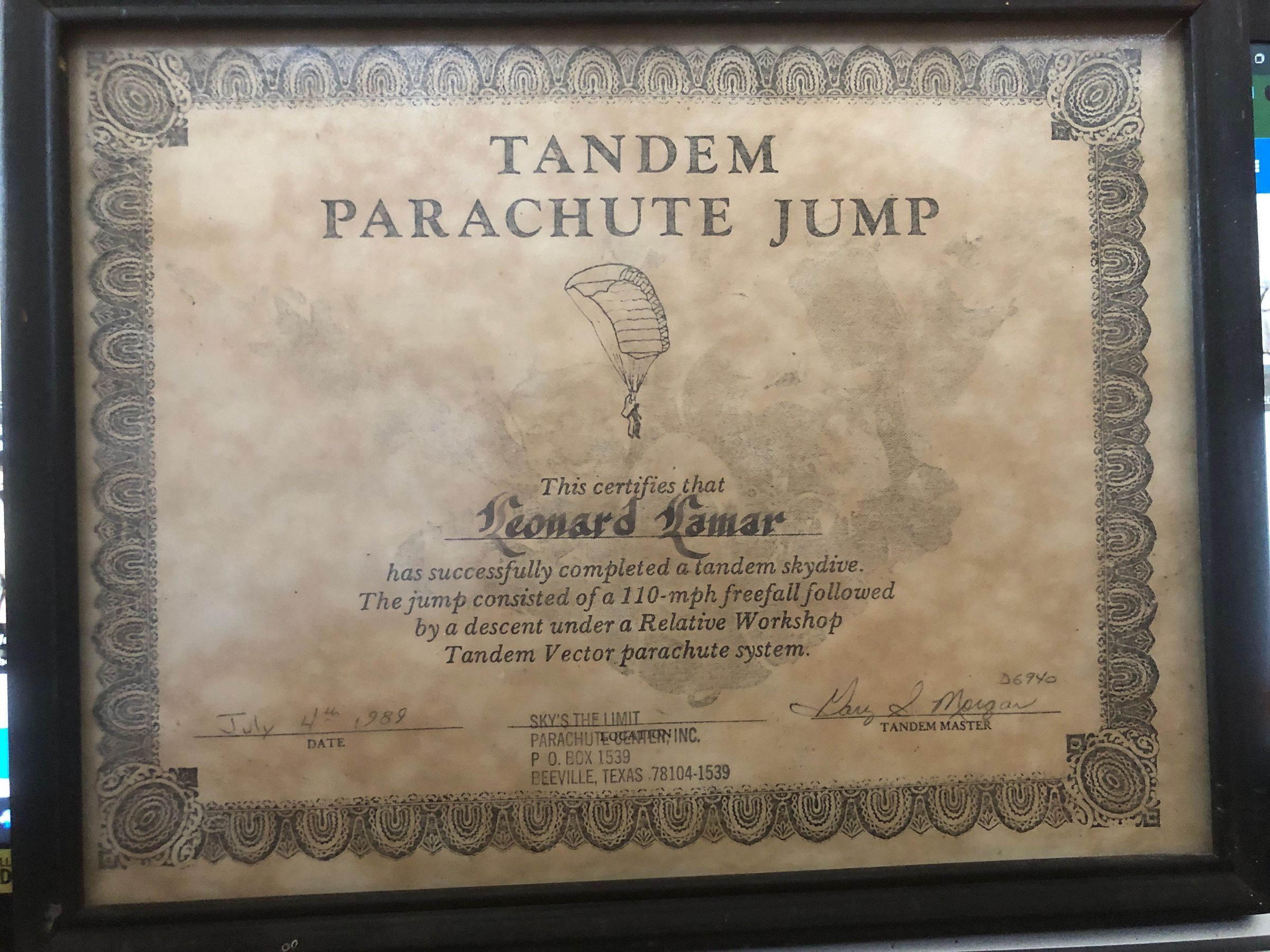 Given to Leonard Lamar for a successfully complete tandem skydive that consisted of 110mph freefall followed y a descend under a Relative Workshop Tandem Vector parachute system