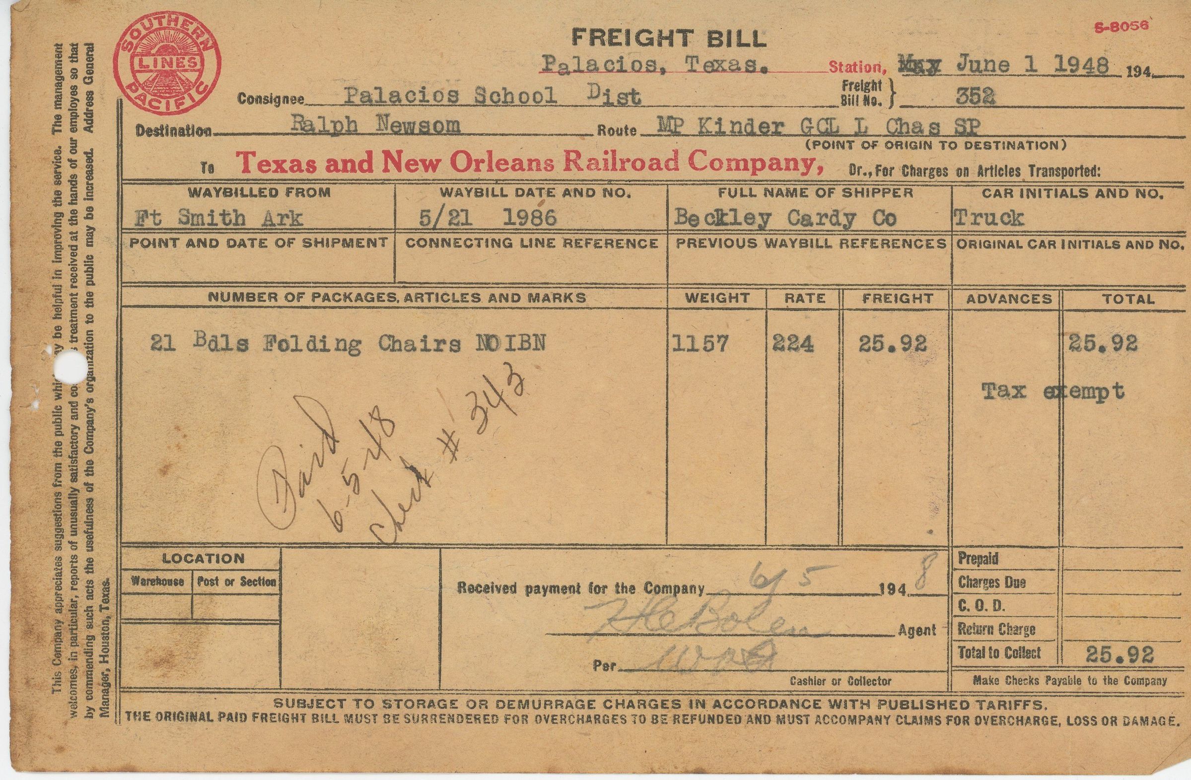 Freight Bill for Palacios ISD purchase of folding chairs.