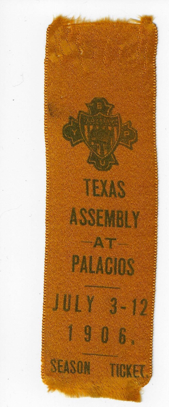 Golden Yellow Ribbon. Texas Assembly at Palacios, July 3-12, 1906, Season Ticket. BYPU