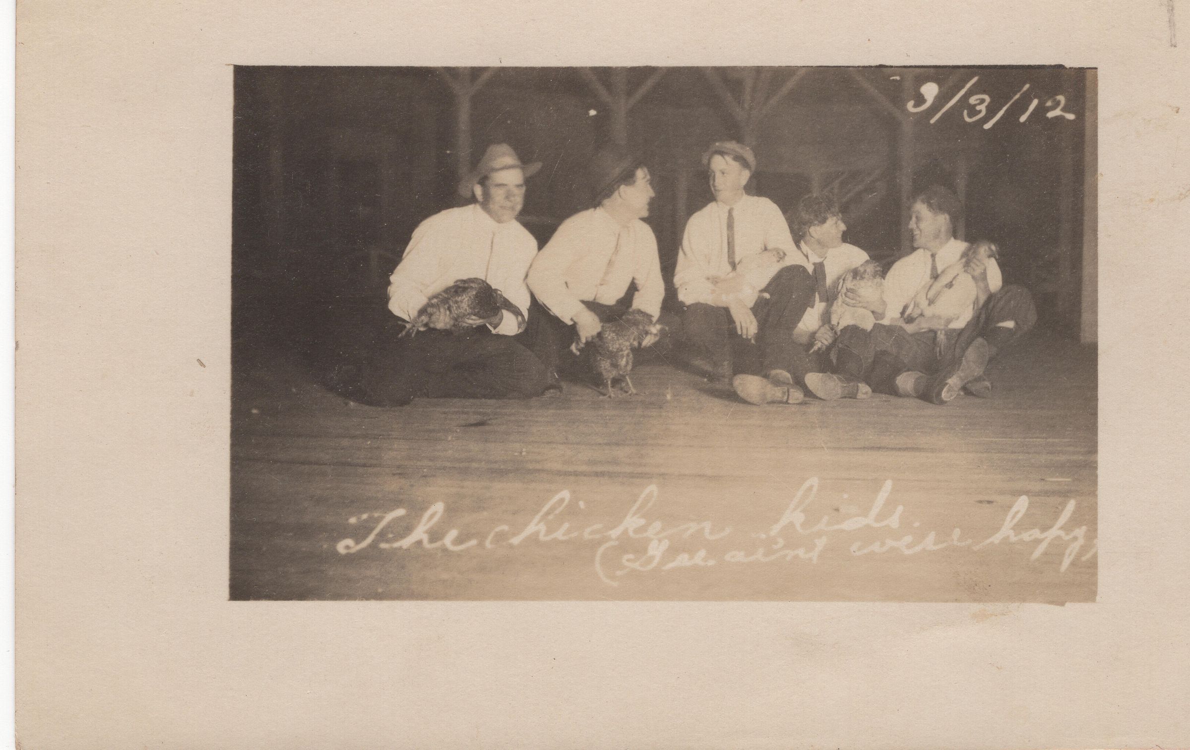 A group of young men with their chickens in a barn.