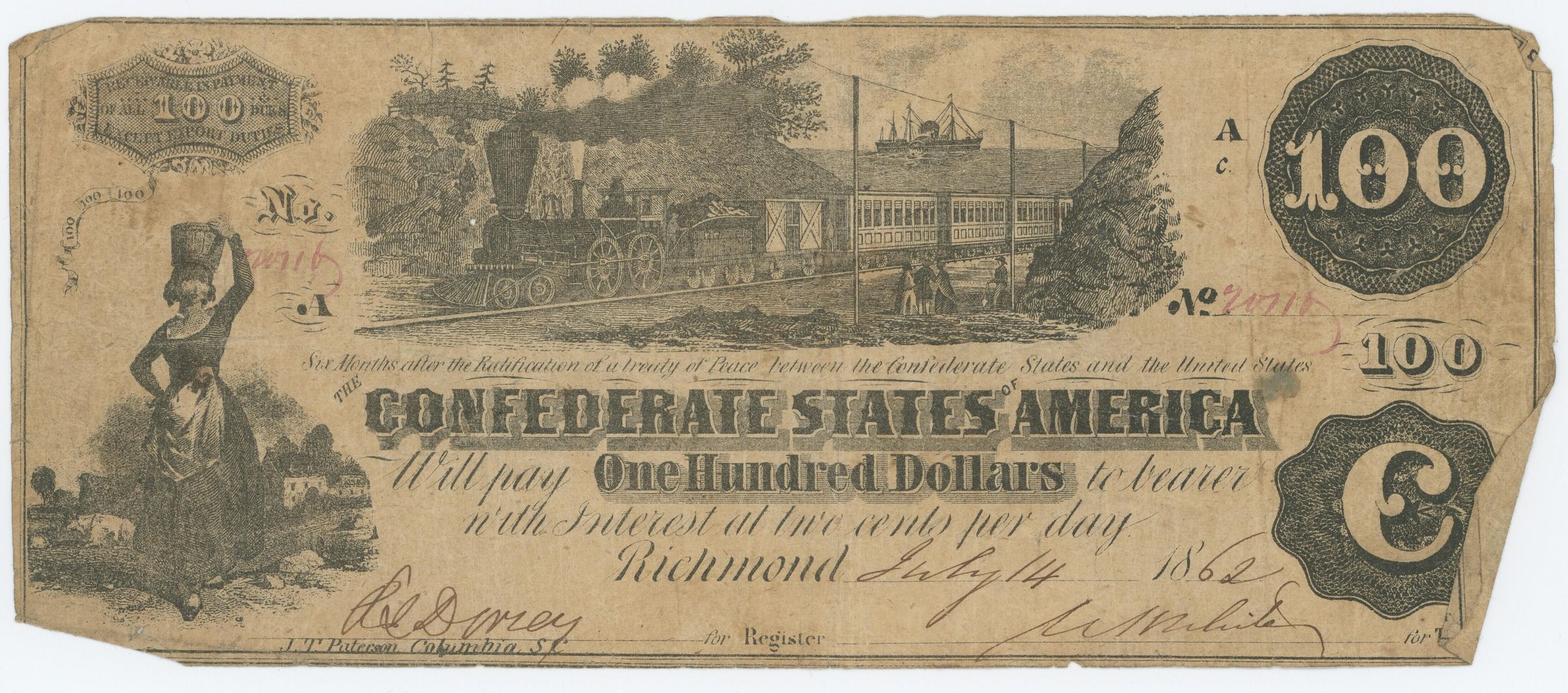 Six months after the Ratification of a treaty of Peace between the Confederate States and the United States, The Confederate States of America will pay One Hundred Dollars to bearer in the interest at two cents per day.Collection