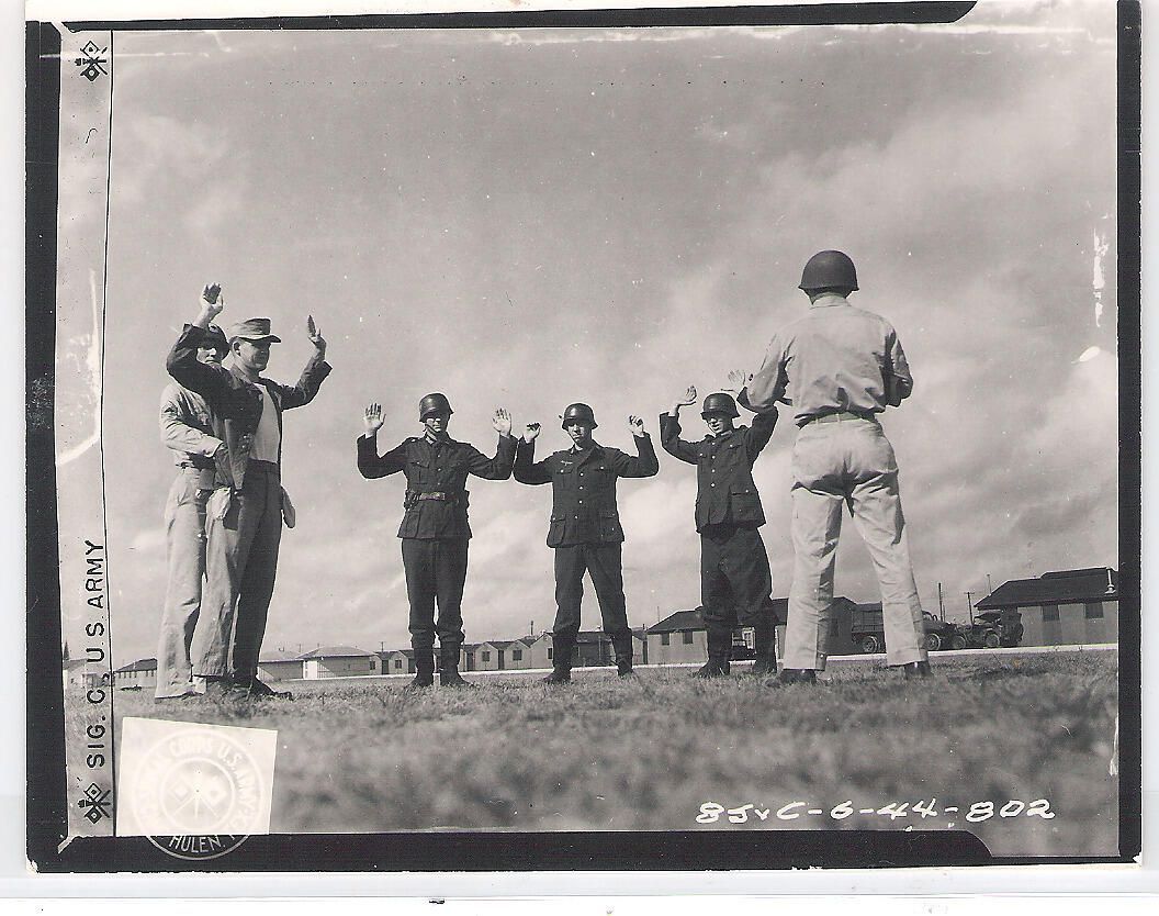 Photograph of troops at Camp Hulen simulating the capture of Nazi soldiers. In this simulation, two American soldiers are holding up and checking out "Nazi" soldiers.Context