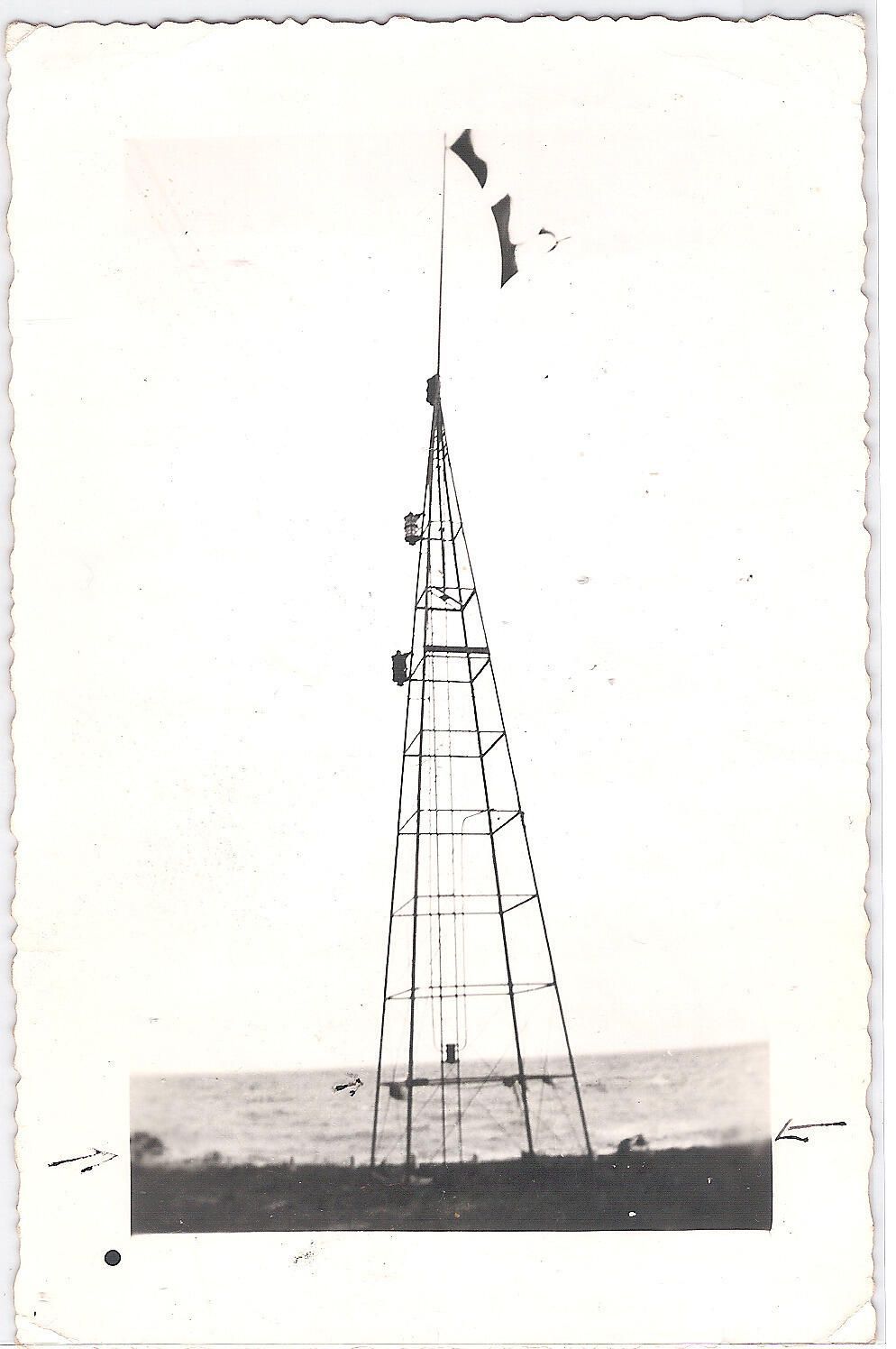 ----- rice etc. caught on iron work. Water covered this shore on Sunday morning, August 1942. Arrows below are where seawall is built. Weather Bureau Tower Flags are hoisted as storm signals. Many different kinds of flags for various types of storms or winds. If they hoisted one every time it rained would have one up most of time.Collection