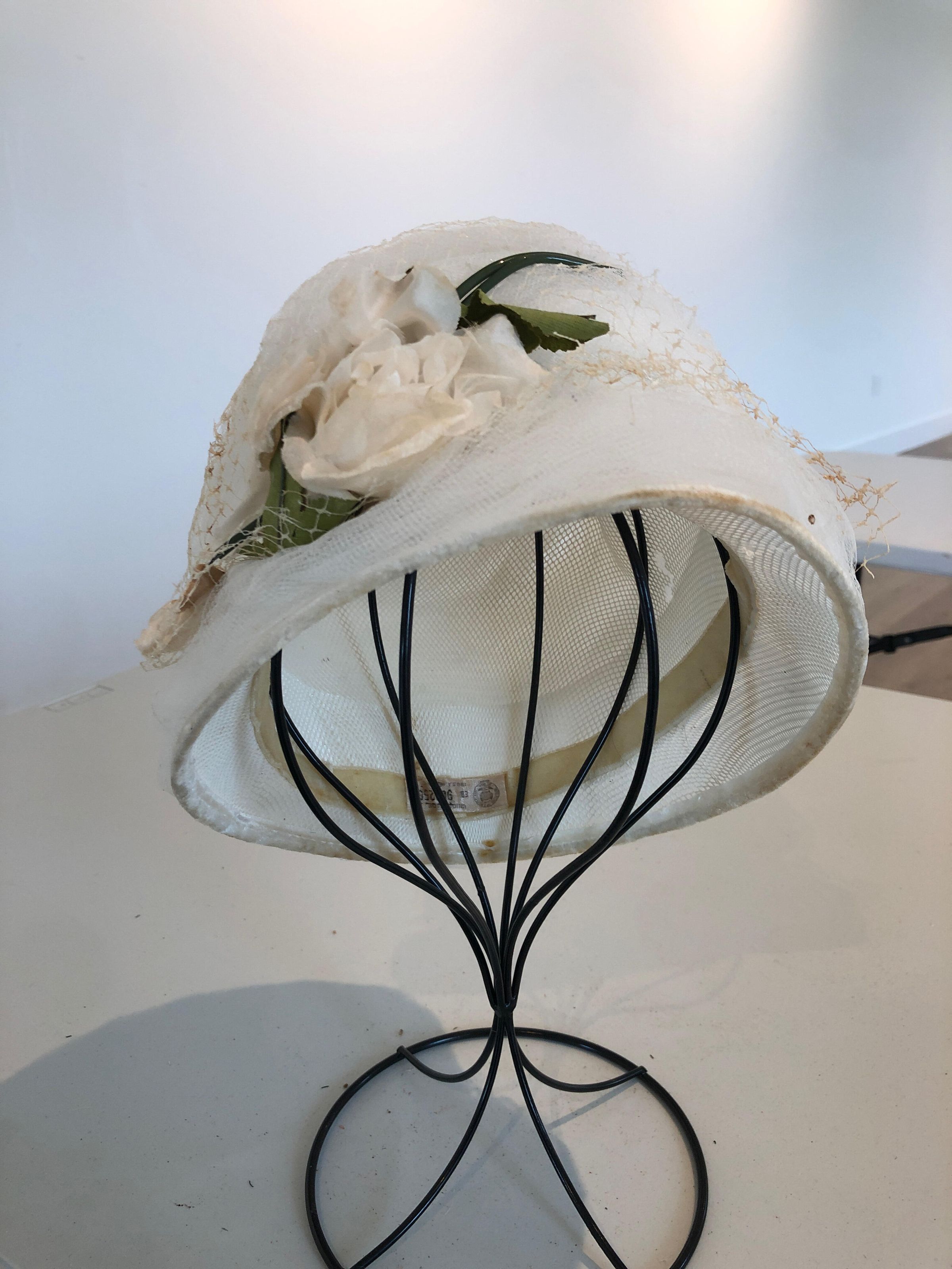 White lace/canvas hat with fishnet and a white flower on topCollection