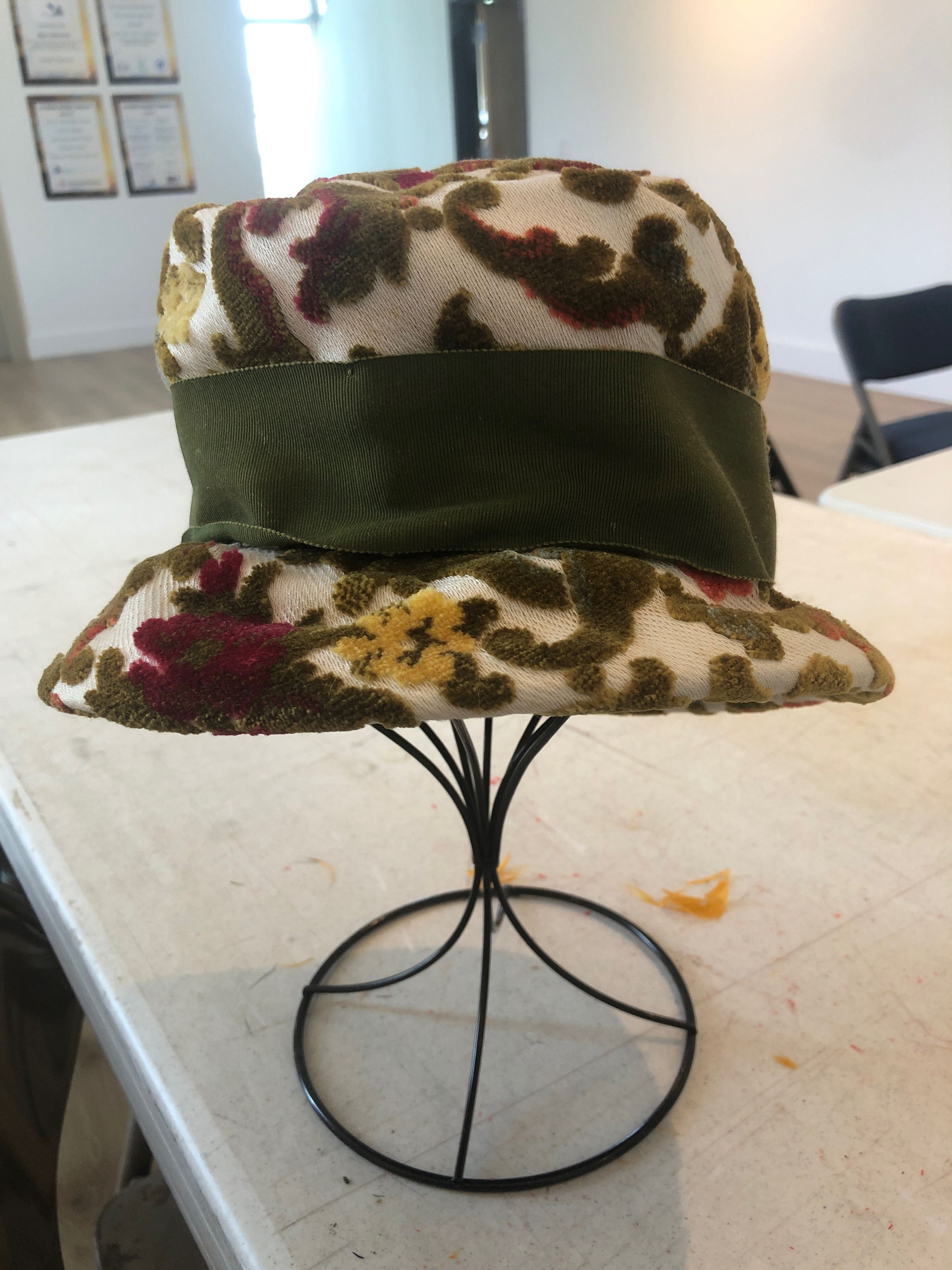White hat covered in embroidery, leaves, stems, and flowers, with a large green ribbon surrounding the hatCollection