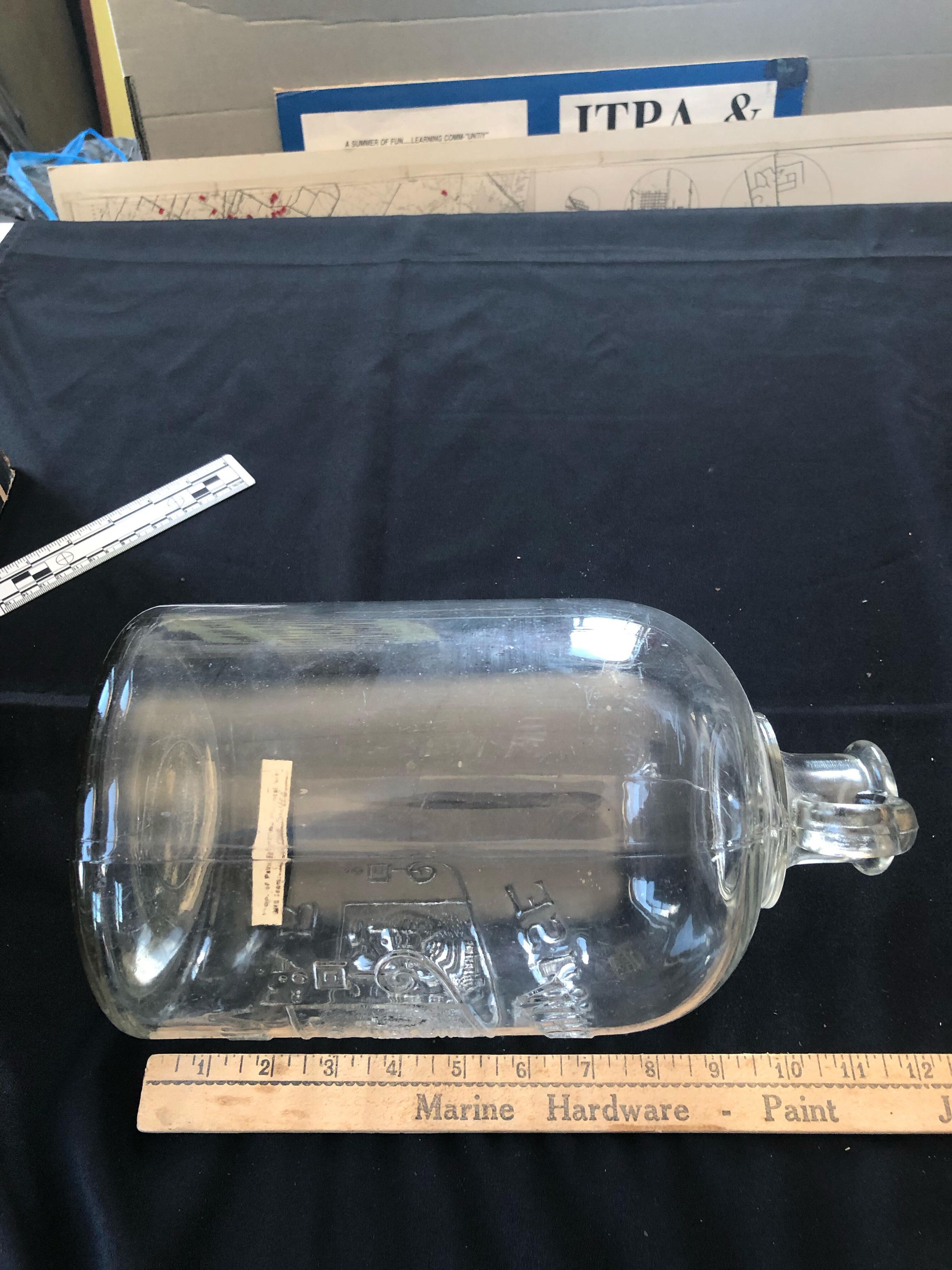 Large glass jar, about a foot in height, with a small circular handle on the top and a picture of the White House on the front and the letter B on the bottom