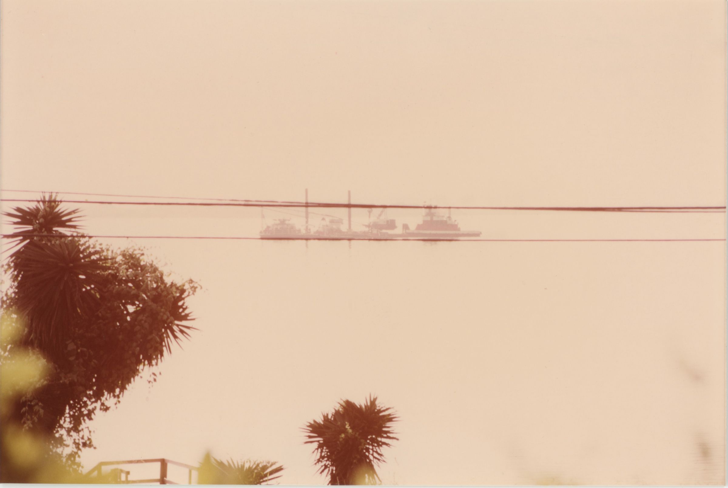 Work Barge being pushed up upper East TresPalacios Bay preparatory to helping lay a pipeline across the Tres Palacios River.