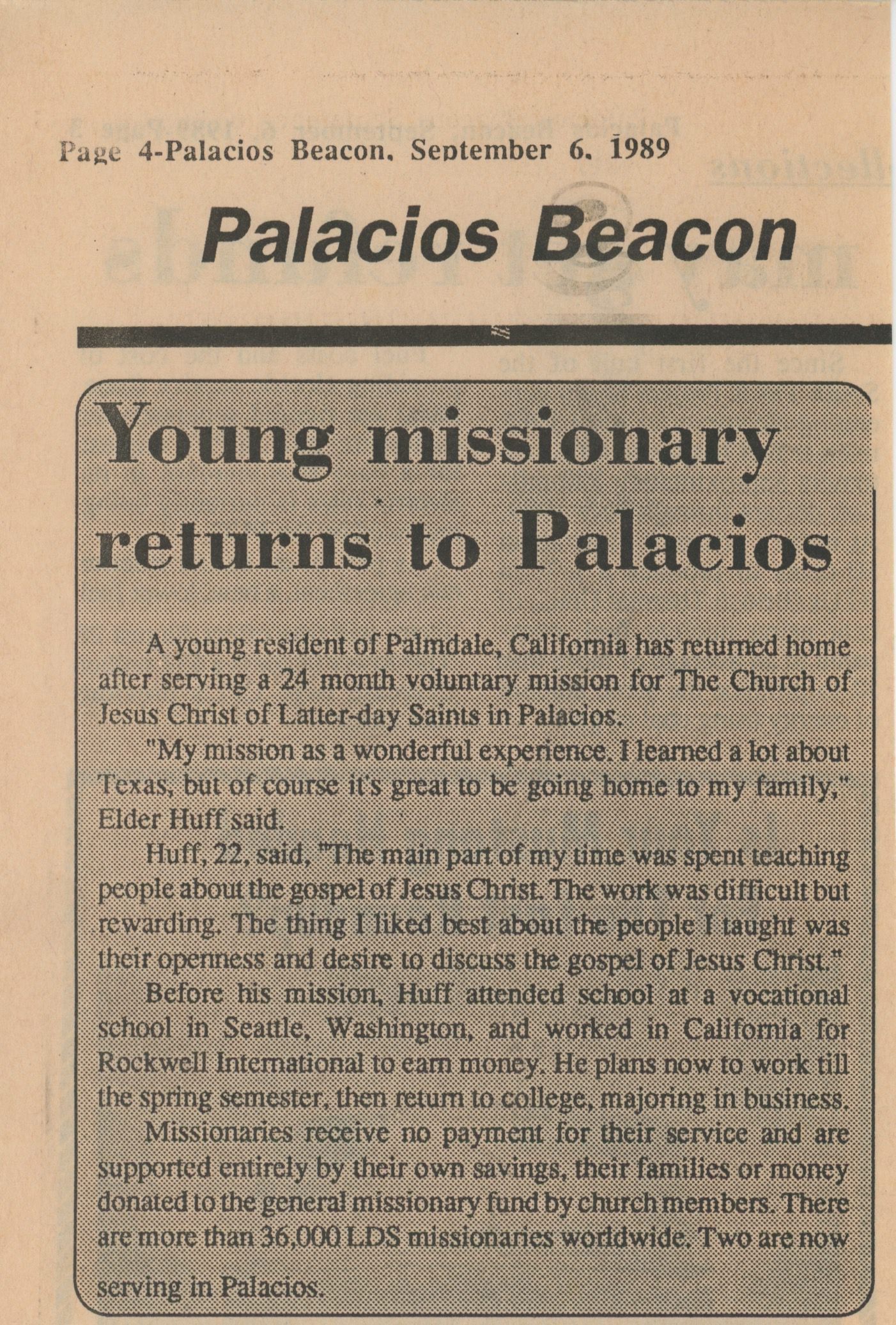 Young Missionary returns to Palacios