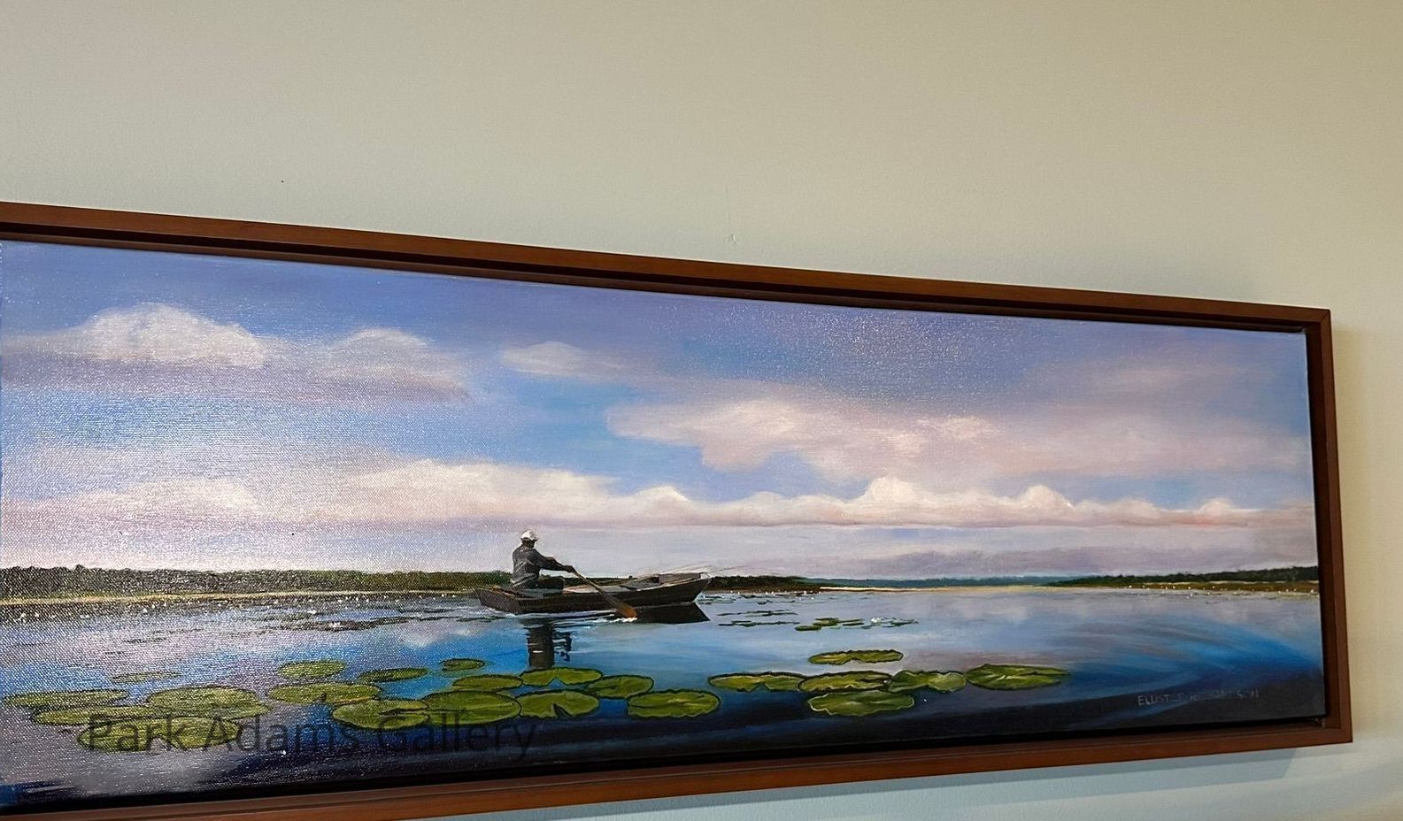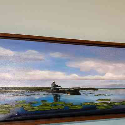 Fisherman in robot surrounded by lily padsType of Painting