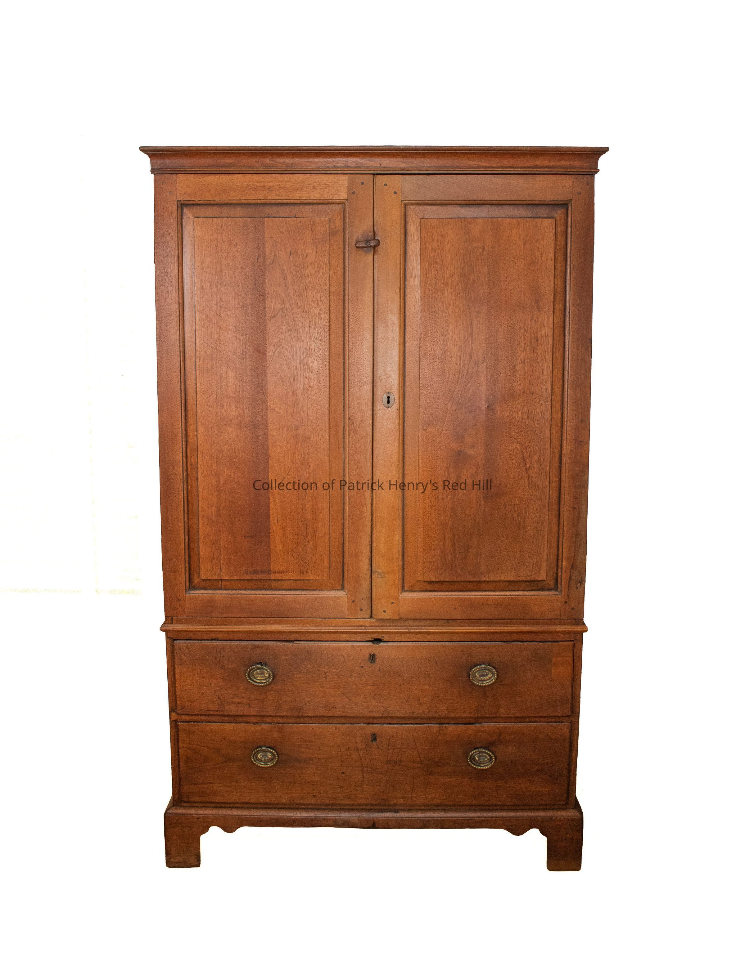 This clothes press was acquired by Patrick Henry around 1780 and came to Red Hill upon his arrival around 1796. Following Henry’s death, the press was listed on the 1799 estate inventory as "1 walnut press," valued at £6. In October 1817, his son, Edward Winston Henry (1794–1872), received the press as a wedding gift from his mother, Dorothea Dandridge (1757–1831).