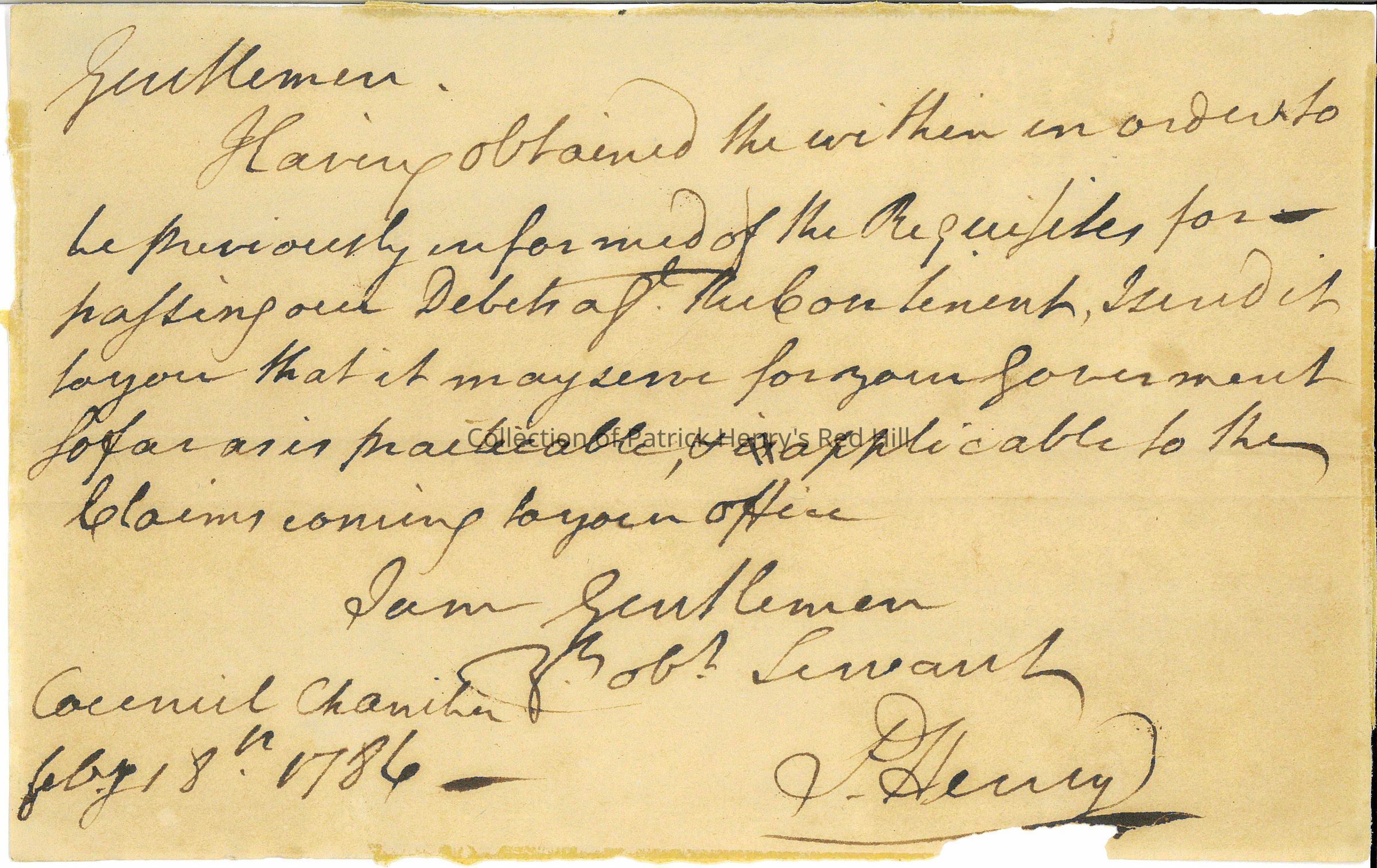 This letter was written by Patrick Henry to the Governor's Council in February 1786. At this time, Henry was serving in his fifth and final term as governor of Virginia. His term lasted from December 1785 to December 1786.