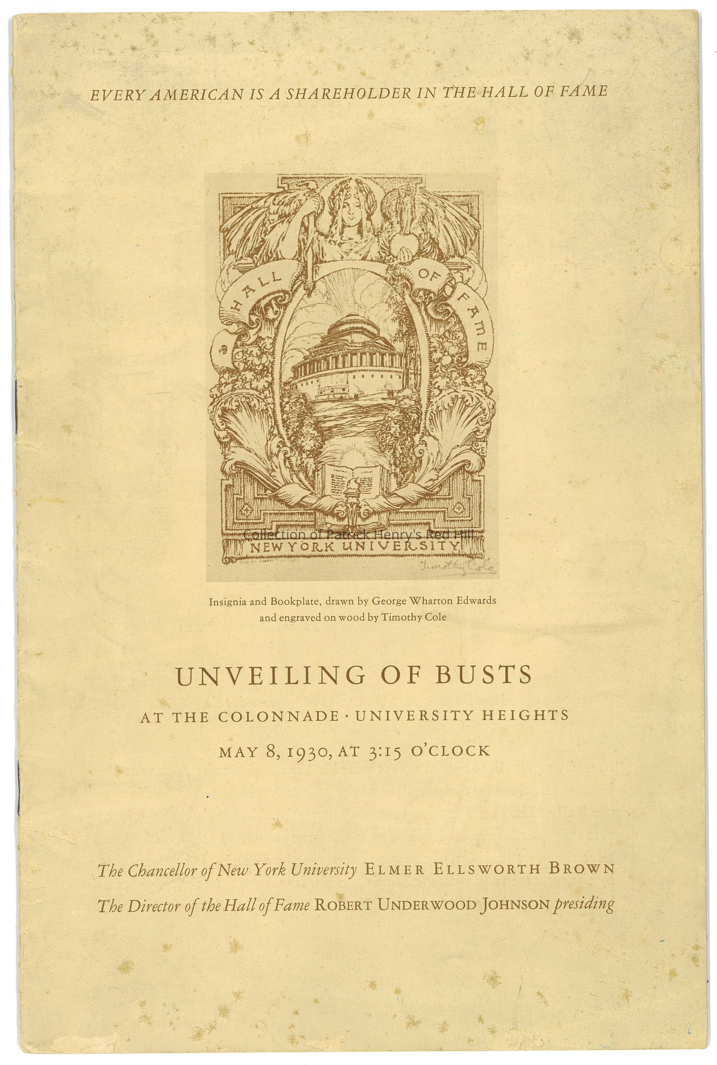 On May 8, 1930, a bust of Patrick Henry was unveiled for inclusion in the Hall of Fame for Great Americans at New York University. This pamphlet details the ceremony's order of events and provides brief descriptions of all nine busts being installed.