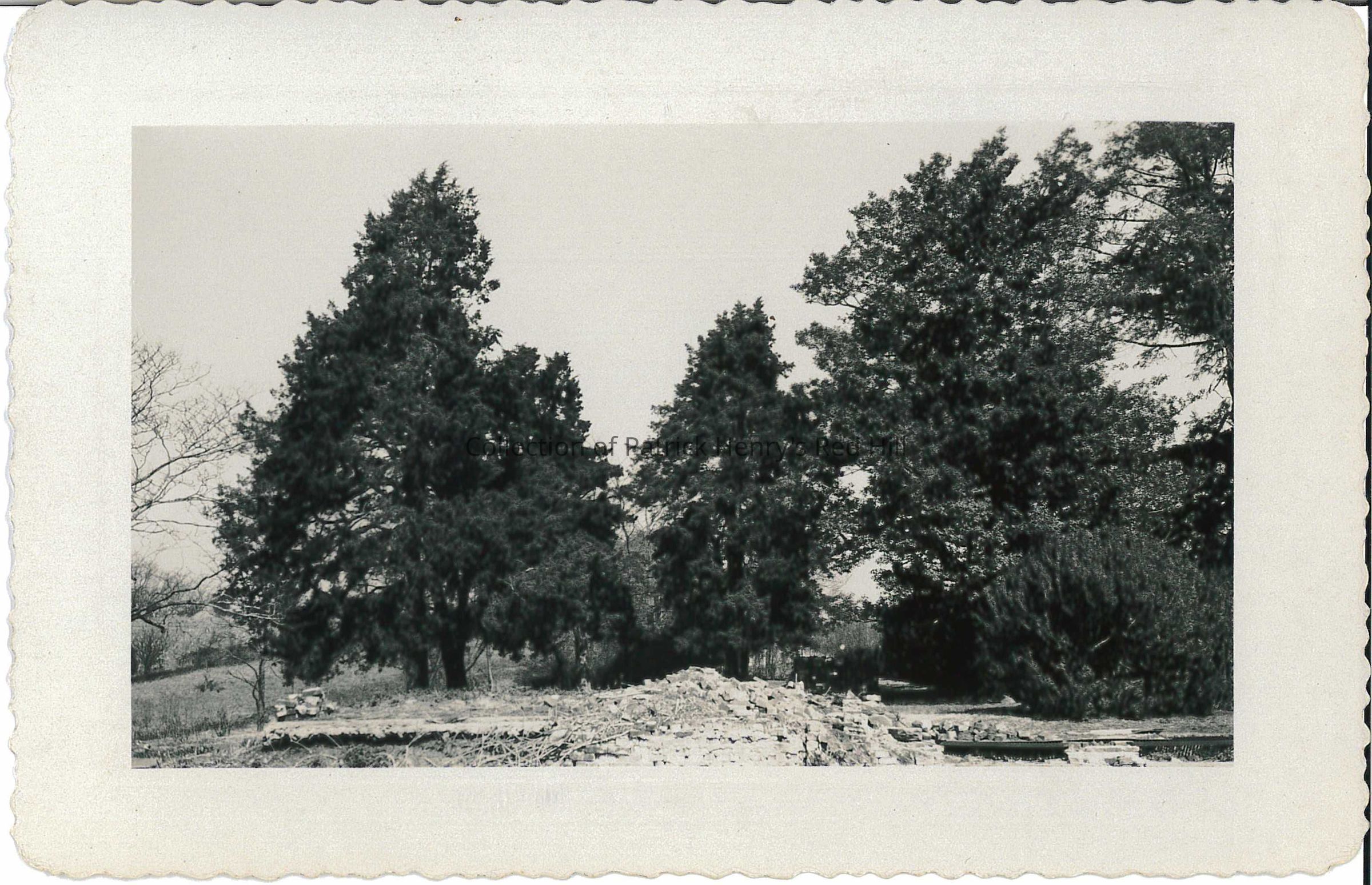 This was one of several photographs found in a collection of papers of Major John Guthrie, past vice president of the Patrick Henry Memorial Foundation. According to the original accession file, these documents were found in the vault at Red Hill in a box marked "Last Things From Eggleston" on October 24, 1970. They proved to be the papers of Major Guthrie, who had died in 1962. They were sorted according to subject matter and date by the cataloger and then filed with the chronological records detailing the history of the Patrick Henry Memorial Foundation. This file contains black and white photographs taken during the Aspen School 4-H clean-up day at Red Hill. In April 1946, twelve 4-H children from Aspen came to work for the day cleaning up the brush and trimming the bushes near the Patrick Henry gravesite and the foundation of the house. Kermit Barbour, Assistant Charlotte County Extension Agent, worked with the 4-H Club and Major John Guthrie to arrange this work day. A local farmer drove the children in his truck to Red Hill. Some of the local children included in the clean-up day were Robert Lee Marshall, Donnie St. John, Geraldine Tucker Moore, Lois Barton Marshall, and Vivian Claybrook Foster. The children made a second trip a few weeks afterward to finish the job. This image shows the ruined remains of the Red Hill mansion in the foreground. The mansion burned in 1919. These pictures were formerly accessioned with Guthrie's papers under the number 76.72. In 2022, they were removed from those files and renumbered.