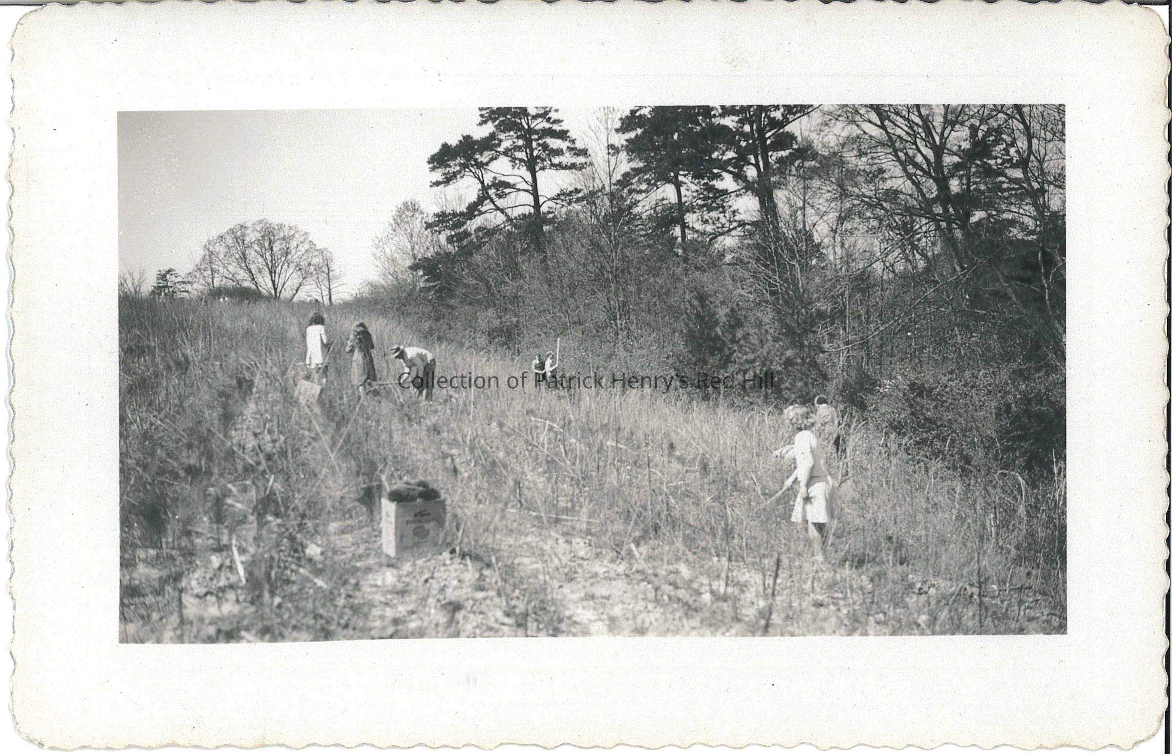 This file contains black and white photographs taken during the Aspen School 4-H clean-up day at Red Hill. In April 1946, twelve 4-H children from Aspen came to work for the day cleaning up the brush and trimming the bushes near the Patrick Henry gravesite and the foundation of the house. Kermit Barbour, Assistant Charlotte County Extension Agent, worked with the 4-H Club and Major John Guthrie to arrange this work day. A local farmer drove the children in his truck to Red Hill. Some of the local children included in the clean-up day were Robert Lee Marshall, Donnie St. John, Geraldine Tucker Moore, Lois Barton Marshall, and Vivian Claybrook Foster. The children made a second trip a few weeks afterward to finish the job.