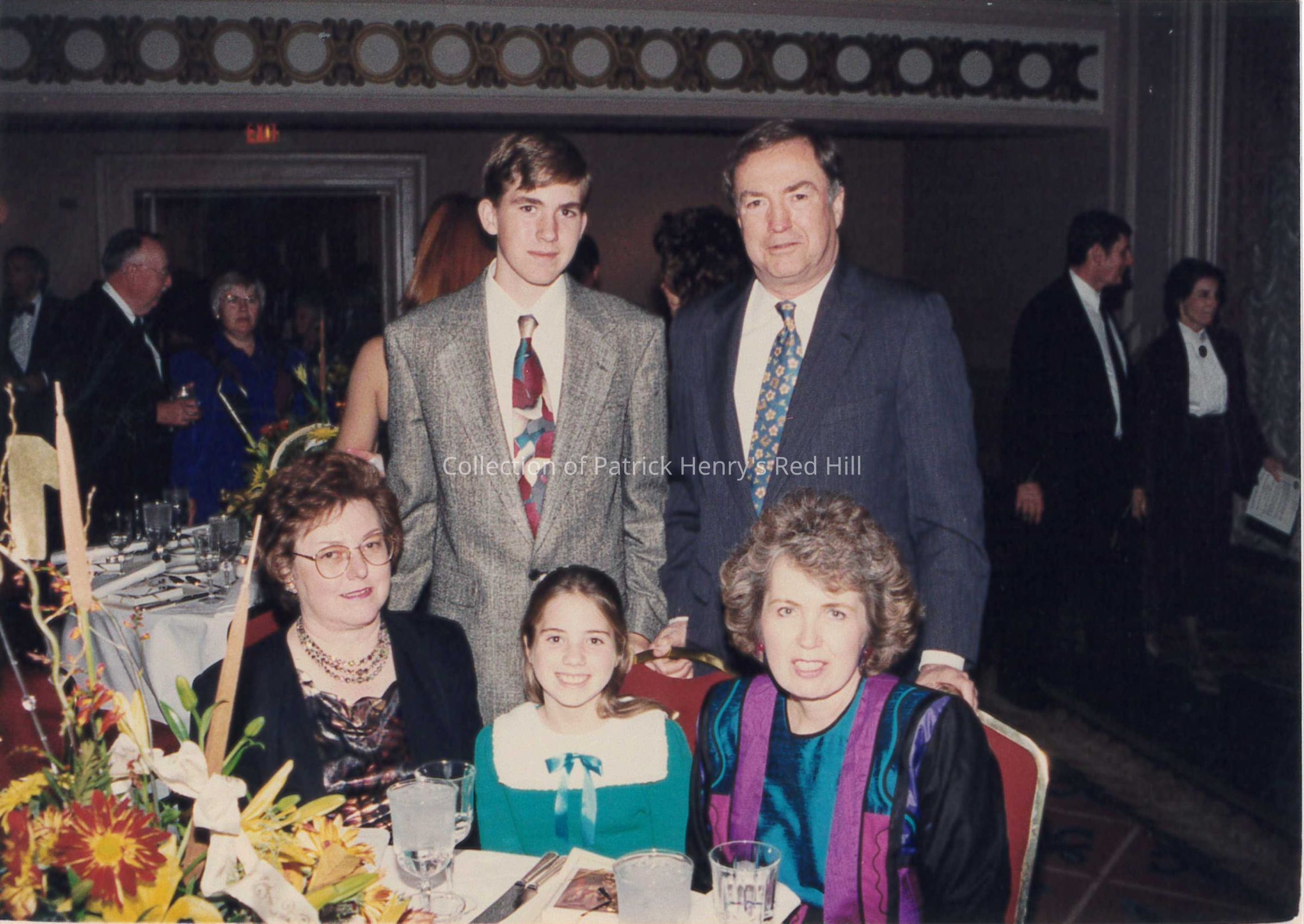 Color photograph. Rectangular. Shot landscape orientation. Pictured are five individuals posing for a photo at a table. The males stand behind three seated females. The older male standing on the right is Richard Will, and the younger male to his left is his son, Stephen Will. The woman seated at the far right is Carol Will, Richard's wife. The young girl in the middle is the daughter, Shannon Will. The older woman seated at the far left is Mrs. William Duncan (her first name is Leah).