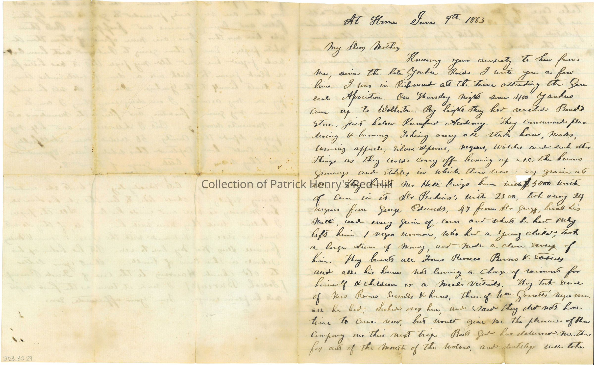 Knowing your anxiety to hear from me, since the late Yankee Raid I write you a few lines. I was in Richmond at the time attending the General Association. On Thursday night some 400 Yankees came up to Walkerton. By light they had reached Bond's Store, just below Rumford Academy. They cannoned plan [clering?] & burning. Taking away all stock, horses, mules, evening apparel, silver spoons, negroes, watches and such other things as they could carry off burning up all the barns grenerys and stables in which there was any grains at all. They burnt Mr. Hill ki_ barn with $5000 worth of corn in it. __ Perkin's with 25 00, took away 29 negroes from George Edwards, 47 from __ gr__g_, burnt his mill, and every grain of corn and wheat he had. Only left him 1 negro woman, who had a young child, both a large sum of money, and made a clean sweep of him. They burnt all James Rowes Barns & stables and all his houses, not leaving a c____ of ______t for himself & children or a meals victuals. They took several of Mrs Rowes Servants & horses, then of Wm Go__ 's negro __ all he had. Looked over here, and said they did not have time to come now, but would given me the pleasure of their company on their next trip. But God has delivered me thus far out of the mouth of the wolves, and doubtless will __
