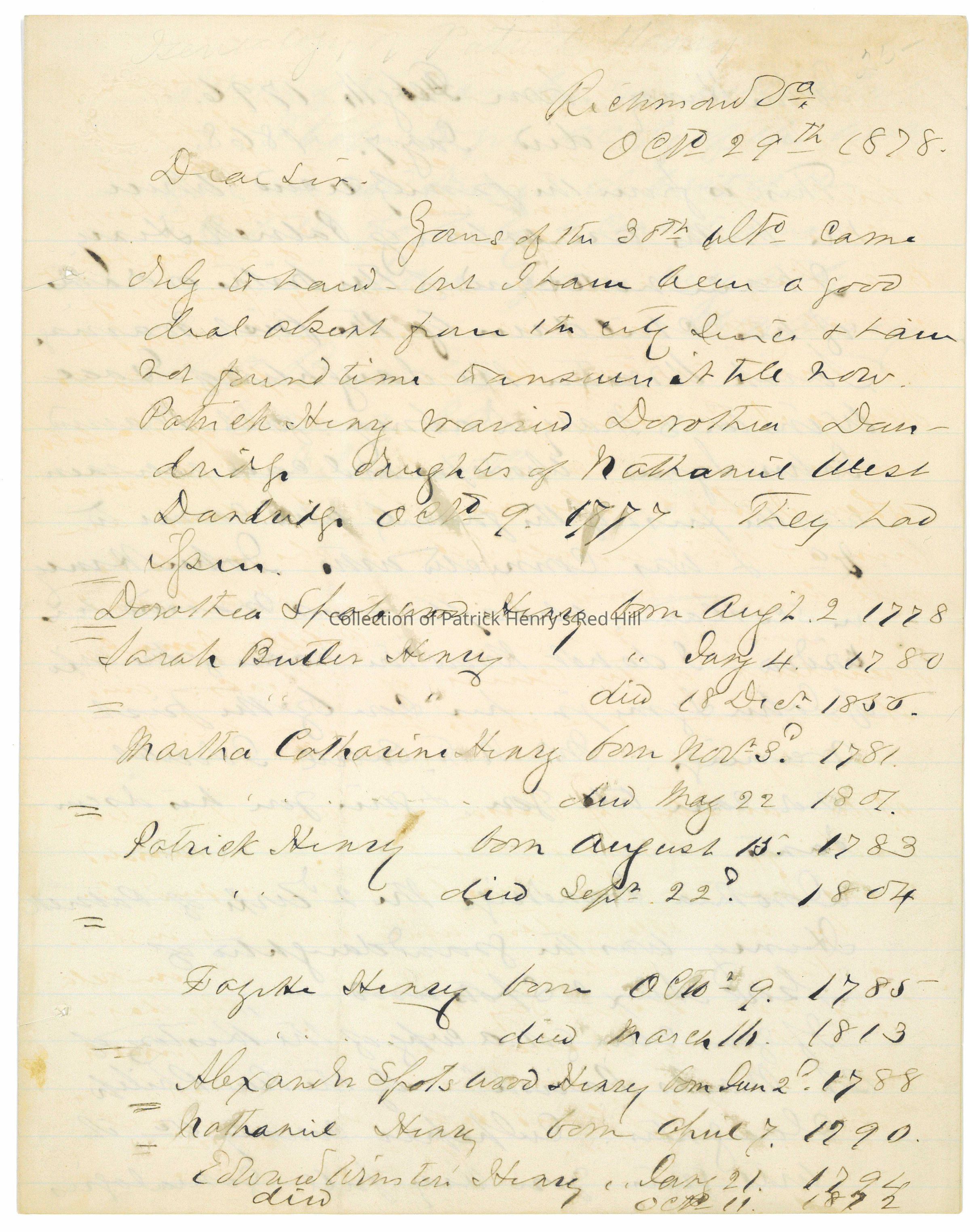This letter was written by William Wirt Henry (1831-1900) to Alexander Brown (1843-1906) in October 1878. In it, Wirt Henry details the partial genealogy of the children of Patrick Henry (1736-1799) and Dorothea Dandridge (1757-1831). He does not include their two children who did not make it to adulthood. The children of Henry's first wife, Sarah Shelton (1738-1775), are not listed by Wirt Henry, who admits he has "no record of the births or deaths of his children of the first marriage."