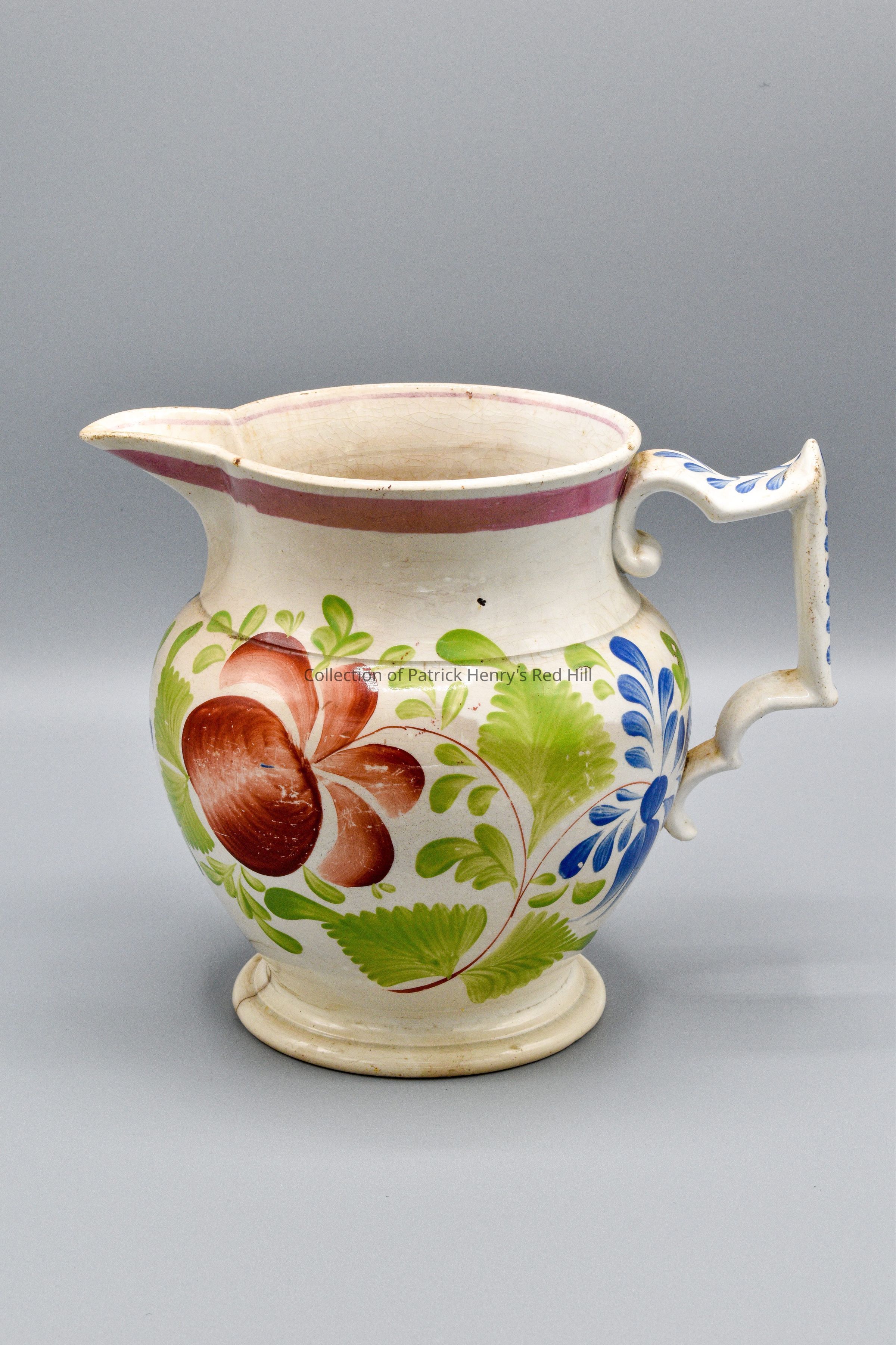 The pitcher was, at one time, paired with a matching washbasin to be used to clean oneself. Although no written documentation confirms John and Elvira's ownership, there are several listings of washbasins in an estate inventory of Red Hill taken after John's death in 1868. For example, "1 Wash Bowl & pitcher" valued at $1.00 appear in the nursery of the main house. This entry may refer to this pitcher.