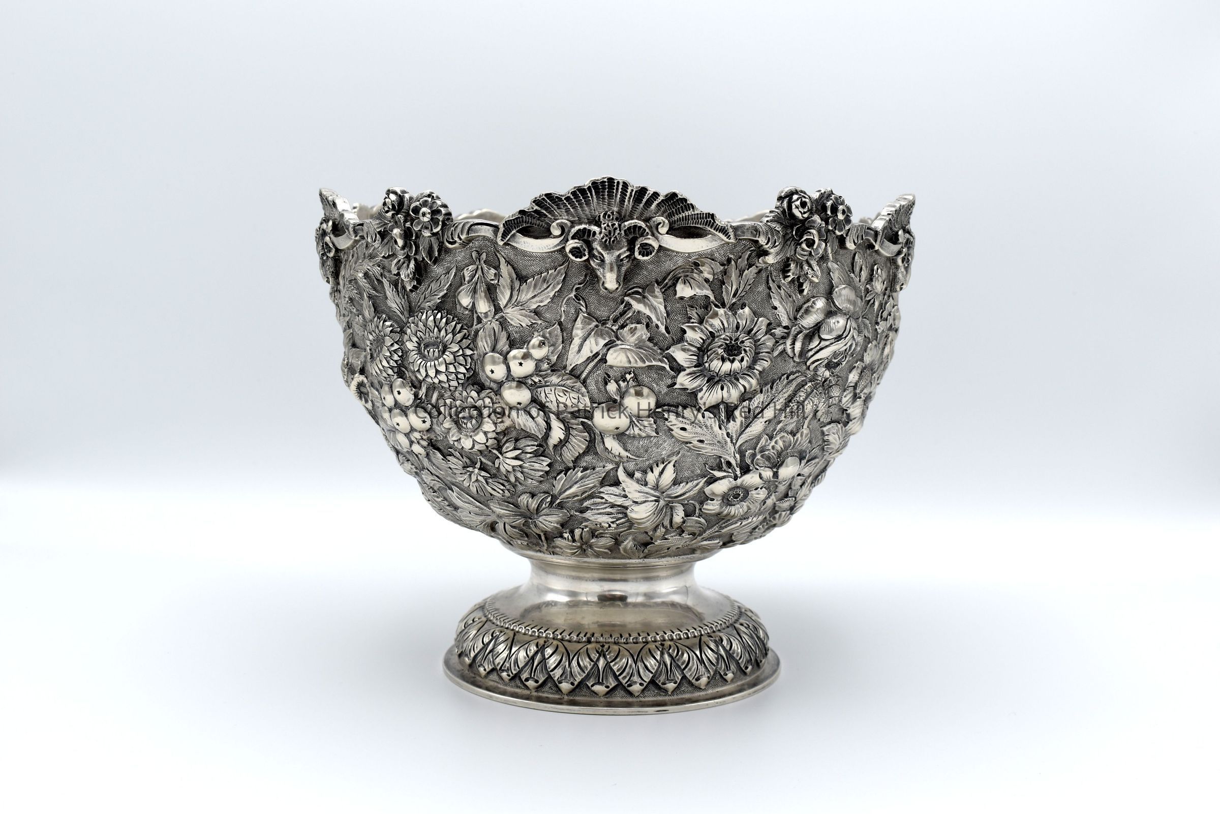 The silversmithing company, Samuel Kirk & Son, produced this bowl between 1890 and 1896. It is made of 925/1000 silver, which the company first produced in 1886. Samuel Kirk (1793–1872) established his company in Baltimore, Maryland, and is best known for introducing repoussé—a metalworking technique in which a malleable metal is shaped by hammering from the reverse side to create a design in low relief—to the United States.