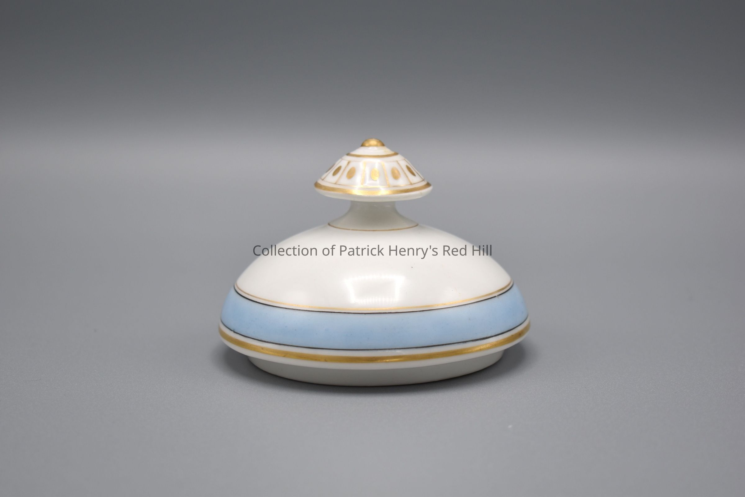 This sugar bowl lid is part of a porcelain tea set that belonged to Margaret Ann Henry Miller (1827–1881). Margaret Ann Henry was born at Red Hill, the oldest child of John (1796–1868) and Elvira McClelland Henry (1808–1875), and a granddaughter of Patrick Henry through her father’s side. She married William Alexander Miller (1824–1923) in 1849 and the couple moved to Lynchburg, where they lived for the rest of their lives. Mr. Miller purchased this china for his wife sometime after their marriage.