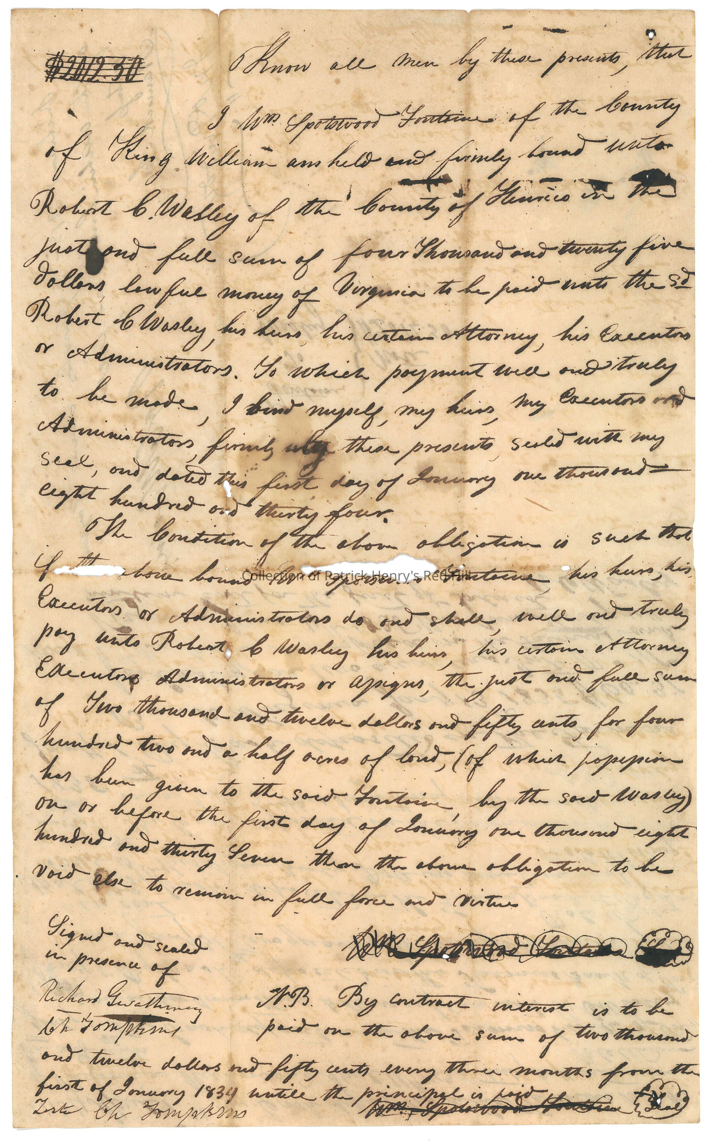 On January 1, 1834, this agreement was drafted between Fontaine and a Robert C. Wasley. Fontaine promises to pay $4,025 to Wasley, half of which ($2,012.50) acts as payment for 402.5 acres of land possessed by Fontaine. The remainder of the sum served as a personal loan to Mr. Wasley to be paid back to Fontaine with interest every three months. Wasley recorded his incremental payments on the back of the agreement⎯from the first one on April 1, 1834, to the last noted one on April 1, 1836⎯that were deposited for Fontaine in the Farmers Bank of Richmond. The bank had been established in the state capitol on February 13, 1812, by the Virginia General Assembly and grew to encompass branches across the Commonwealth. The payment was waived "in full" in Richmond on September 21 of an unknown year, according to a note signed by Wasley and witnessed by Hancock Lee and John Priddy.