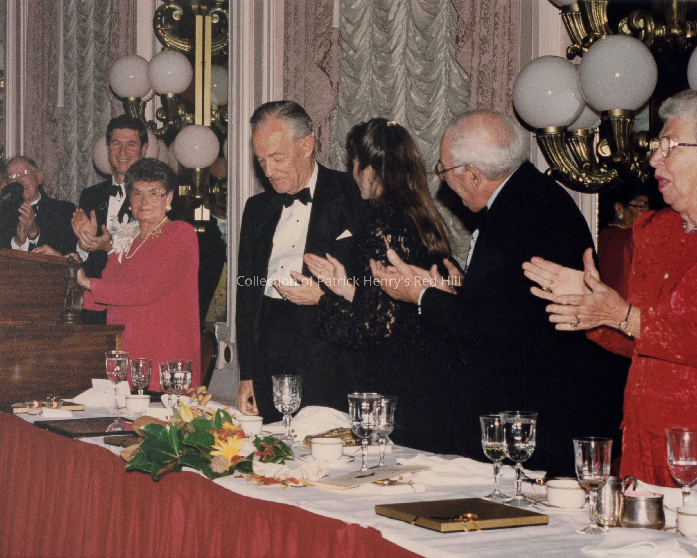 There are several key guests pictured in this photo. Theodore "Ted" W. Graves (1919–2014), who served a president of the PHMF from 1977-1991, gave the invocation. George Allen (1952–) was the Governor of Virginia at the time of this event and served as Governor from 1994 to 1998. Susan Allen (1964–) was his wife. Carolyn Lusardi was the President of PHMF at the time of the event. She gave the "Recognition of Distinguished Guests" and shared "Remembrances of Fifty Years." Mills E. Godwin, Jr.(1914–1999) received the Patrick Henry Award that evening. He served as Governor of Virginia for two non-consecutive terms, from 1966-1970, and from 1974-1978. The PHMF awarded Godwin, Jr. the Patrick Henry Award for "distinguished service to the Commonwealth of Virginia." Irvin D. Walker (1922–2009) was a former PHMF president and gave the benediction to end the evening's program. Geraldine "Gerry" Walker (1923–2008) was Irvin D. Walker's wife.