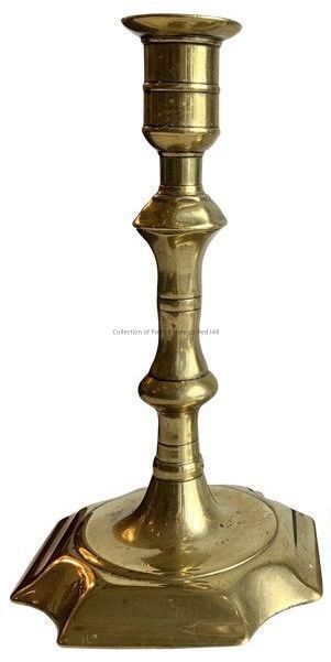 This is a c.1730 cast brass candlestick, made in the Queen Anne style in England.