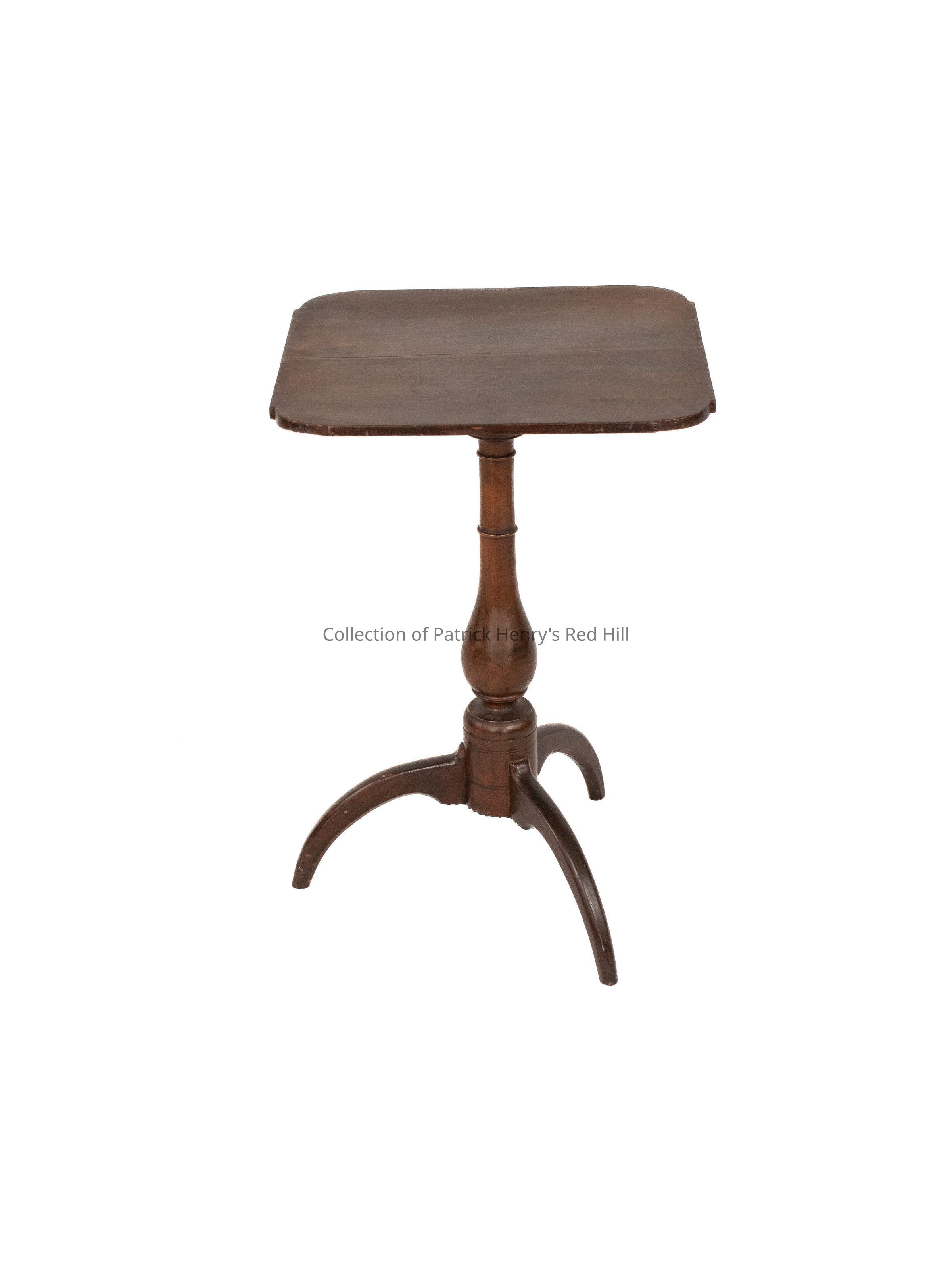 A cherry candlestand. The top of the table is a rounded off square with cut corners. A long crack runs lengthwise across the top of the table. The edges of the table show some wear from age. The table rests on a turned urn central pedestal supported by three tall arched feet. The top is secured to the pedestal with wooden pegs. The base of the table has a saw tooth edge cut out around the bottom.Made/Created
