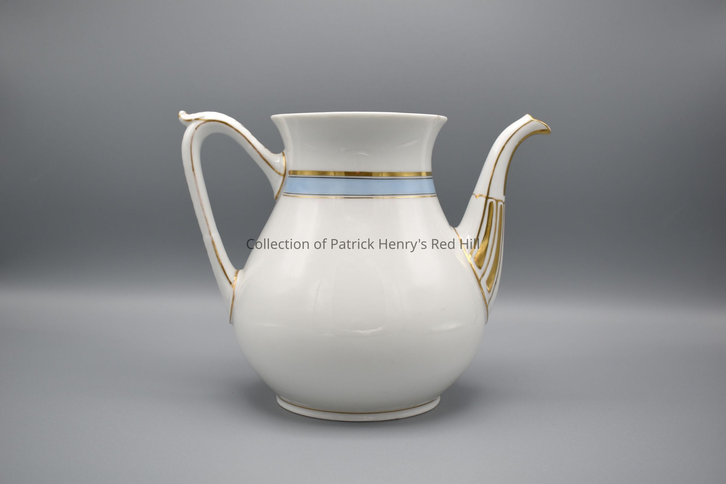 This coffeepot is part of a porcelain tea set that belonged to Margaret Ann Henry Miller (1827–1881). Margaret Ann Henry was born at Red Hill, the oldest child of John (1796–1868) and Elvira McClelland Henry (1808–1875), and a granddaughter of Patrick Henry through her father’s side. She married William Alexander Miller (1824–1923) in 1849 and the couple moved to Lynchburg, where they lived for the rest of their lives. Mr. Miller purchased this china for his wife sometime after their marriage.