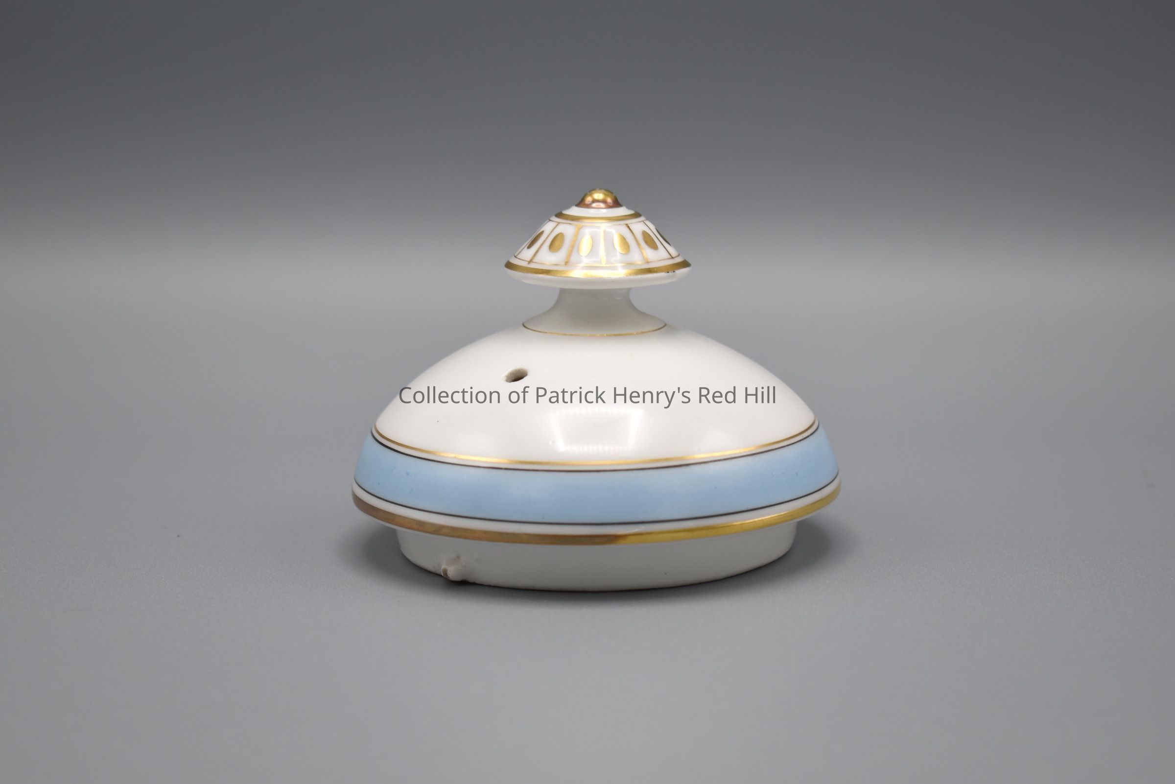 This coffeepot lid is part of a porcelain tea set that belonged to Margaret Ann Henry Miller (1827–1881). Margaret Ann Henry was born at Red Hill, the oldest child of John (1796–1868) and Elvira McClelland Henry (1808–1875), and a granddaughter of Patrick Henry through her father’s side. She married William Alexander Miller (1824–1923) in 1849 and the couple moved to Lynchburg, where they lived for the rest of their lives. Mr. Miller purchased this china for his wife sometime after their marriage.
