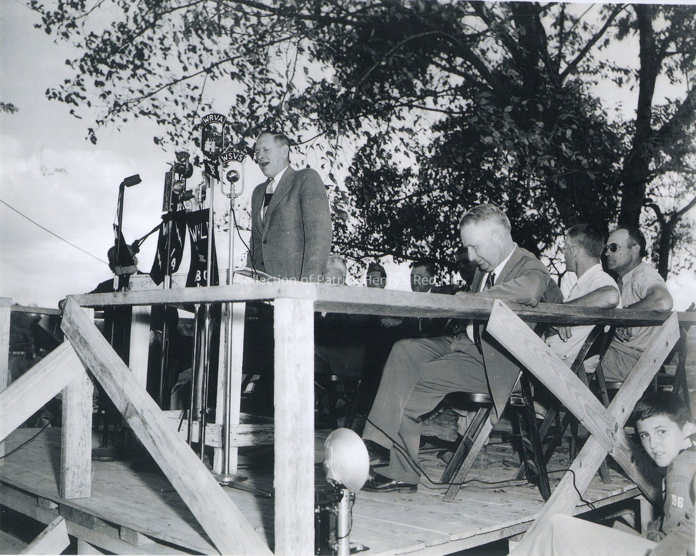 This photograph depicts Congressman Thomas B. Stanley (1890–1970), Representative of the Fifth Congressional District, speaking at "Miracle Day" at the podium on the wooden stage.