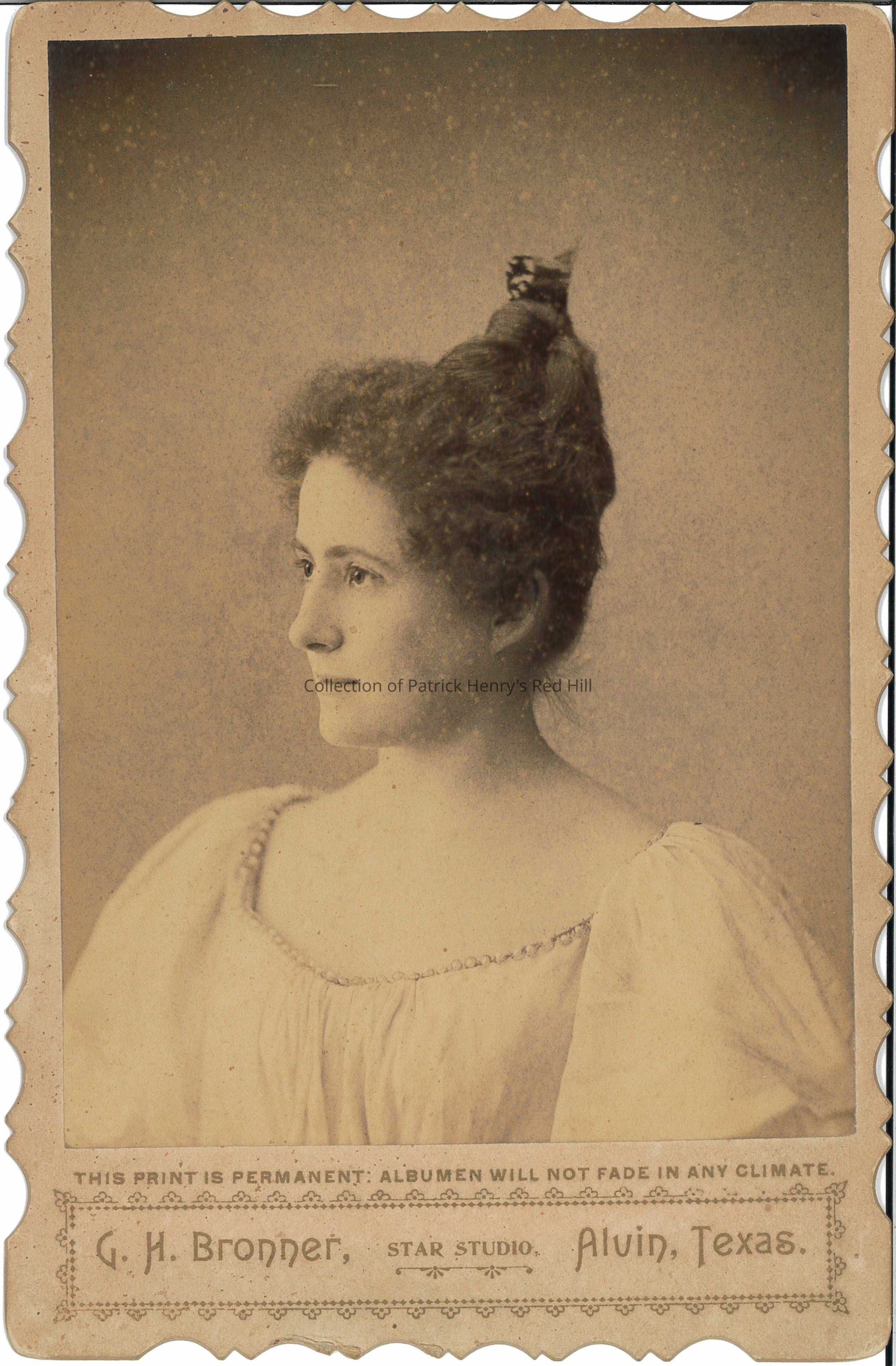 Cornelia (Corrie) Dandridge Sampson, a great-great-granddaughter of Patrick Henry, was born on April 1, 1874, in Dallas, Texas. Her parents, Henry Sampson (1847-1903) and Sarah Spotswood Fontaine (1848-1935), moved the family a year later and at age six, Corrie lived in Williamsburg, North Carolina. Due to its similarities to another photograph of her from the same studio (2023.30.11), this photograph was likely taken in 1891 when she was around age seventeen. She married Malcolm Montross Graham, Sr. (1865-?), on April 4, 1894, and they had two children: Malcolm Montross Graham, Jr. and Sarah Aylett Graham. She died at age 29 on September 13, 1904, at St. Mary's Infirmary in Galveston, Texas.