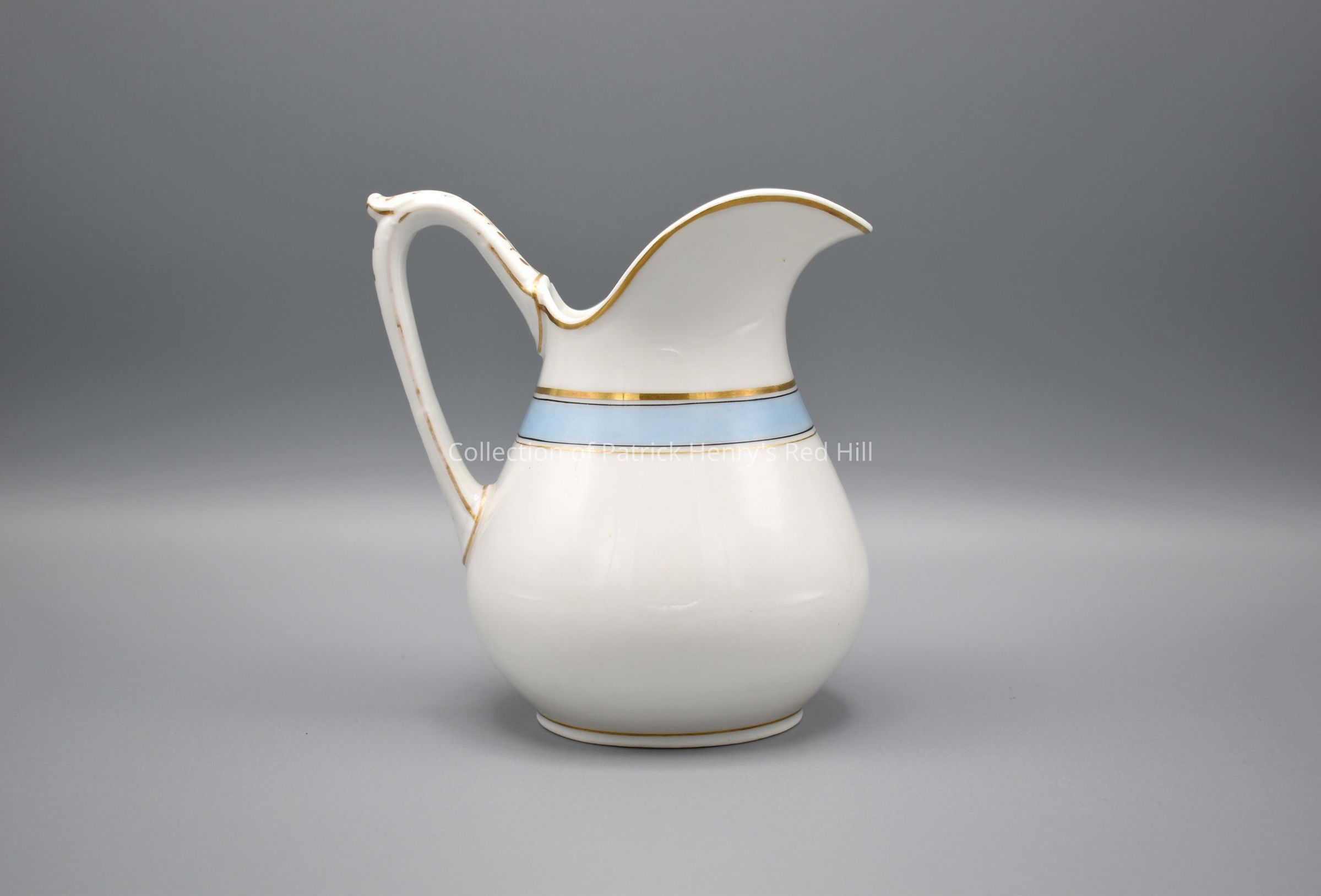 This cream pitcher is part of a porcelain tea set that belonged to Margaret Ann Henry Miller (1827–1881). Margaret Ann Henry was born at Red Hill, the oldest child of John (1796–1868) and Elvira McClelland Henry (1808–1875), and a granddaughter of Patrick Henry through her father’s side. She married William Alexander Miller (1824–1923) in 1849 and the couple moved to Lynchburg, where they lived for the rest of their lives. Mr. Miller purchased this china for his wife sometime after their marriage.