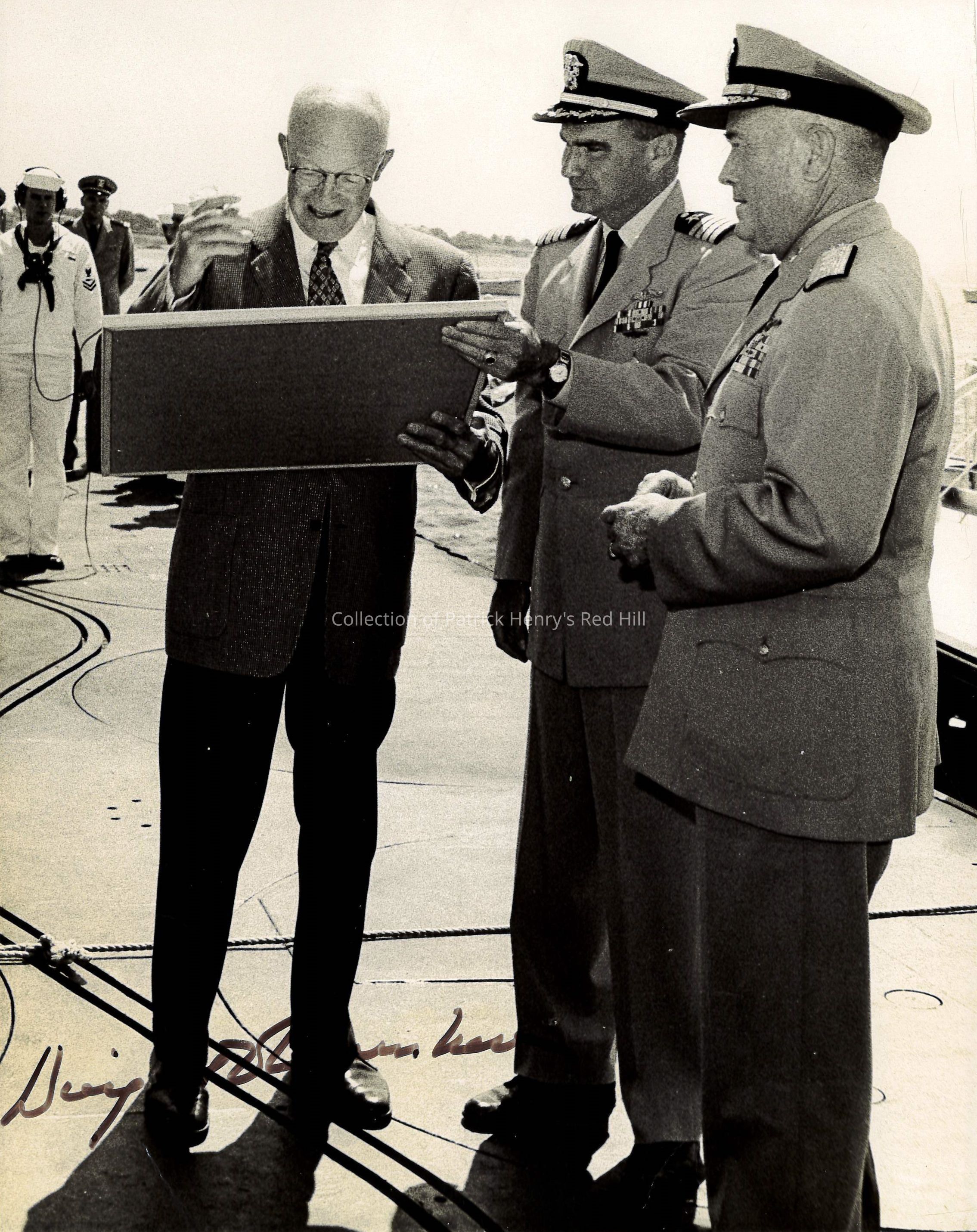 This picture was taken in Groton, Connecticut, on September 22, 1959, when the submarine USS Patrick Henry (SSN599) was commissioned. It shows President Eisenhower, Commander Harold E. Shear (first captain of "Patrick Henry"), and VADM William F. ("Red") Raborn Jr.