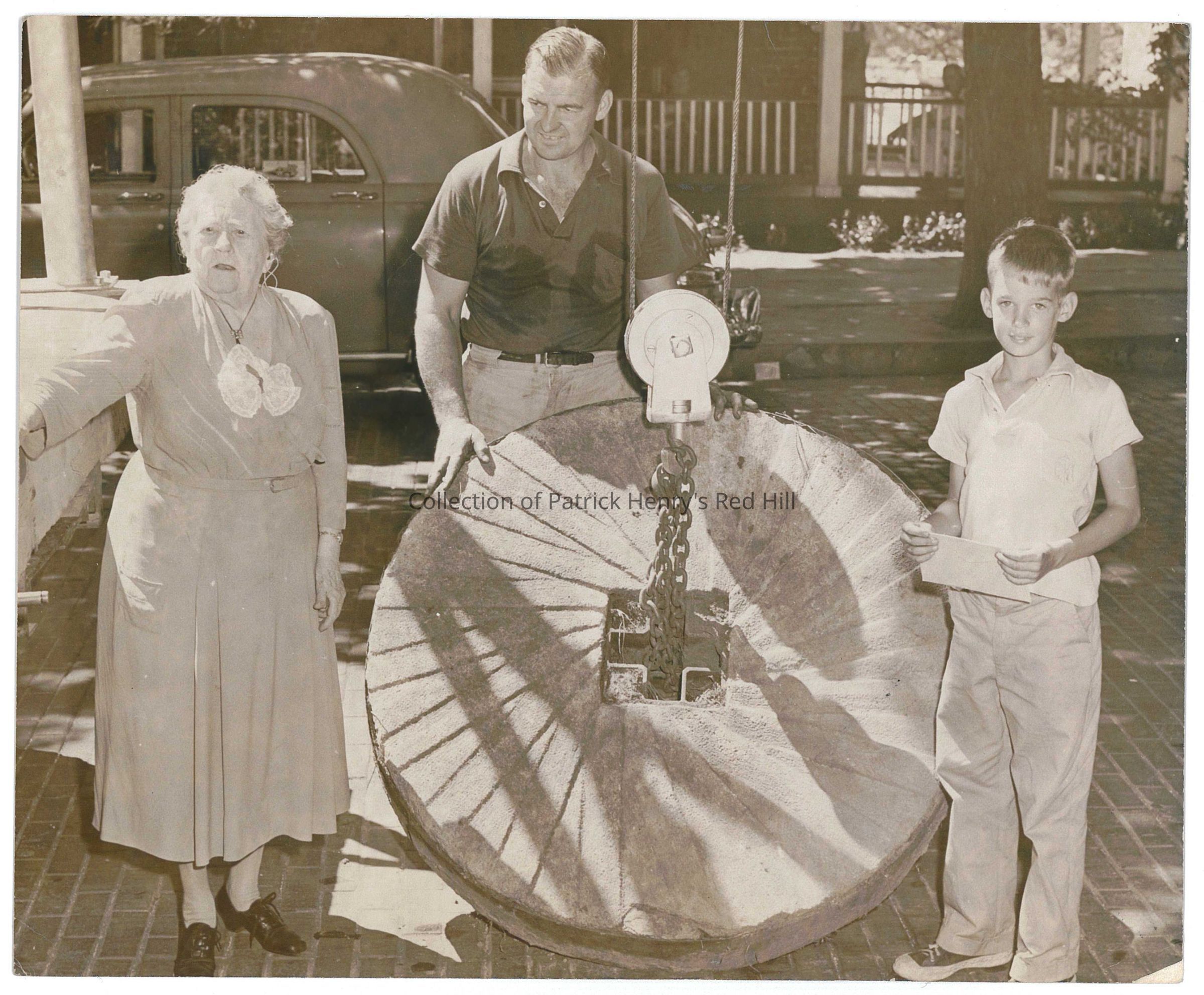 This photograph was taken for a newspaper article published in the “Lynchburg Daily Advance” on September 7, 1954. The photograph shows Elvira Henry Miller (1850–1955), great-great-granddaughter of Patrick Henry and the oldest alumna of Hollins College, standing with Henry Morrell Smiley (1913–1997), then the current owner of Hollins Mill, and her great-great-nephew, Robert “Bobby” Doyle (1941–2021). They stand together, presenting an original millstone from Hollins Mill, which was used to grind grain. John (1786–1859) and Anne Halsey Hollins (1795–1864) donated the money generated by this mill to the Valley Union Seminary in 1855, which later became Hollins College to honor their contributions.