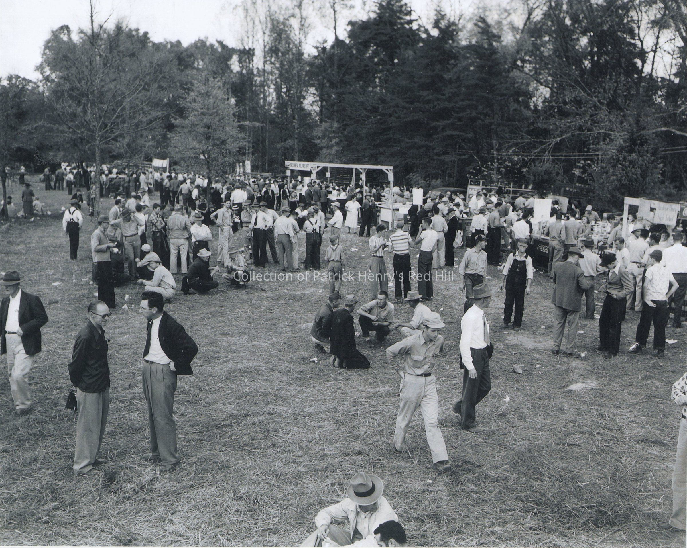 The photograph depicts the crowd gathered around noon, after the plowing of the fields had finished and before the talks began, near the vendor stands. These stands were represented by local institutions such as Randolph-Henry High School and the Brookneal Fire Department. They sit between the tree line and the law office, which is not visible in this photograph but was located to the west.