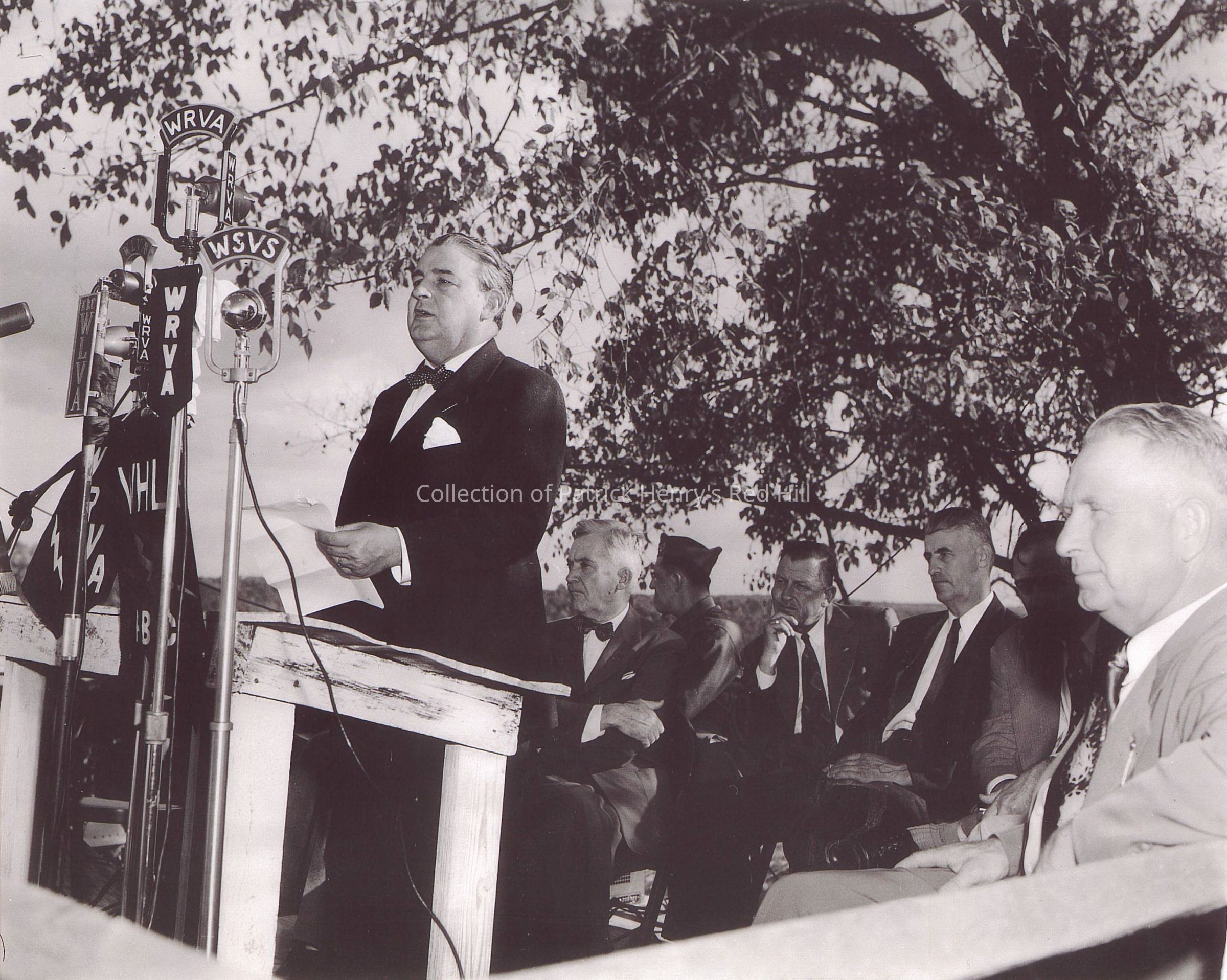 The photograph depicts former Virginia Governor William M. Tuck (1896–1983) giving a speech at the podium on the wooden stage at "Miracle Day". He told the audience that he saw no better-fitted memorial to Patrick Henry and his legacy than to use the historic spot as a rehabilitation home for troubled boys.