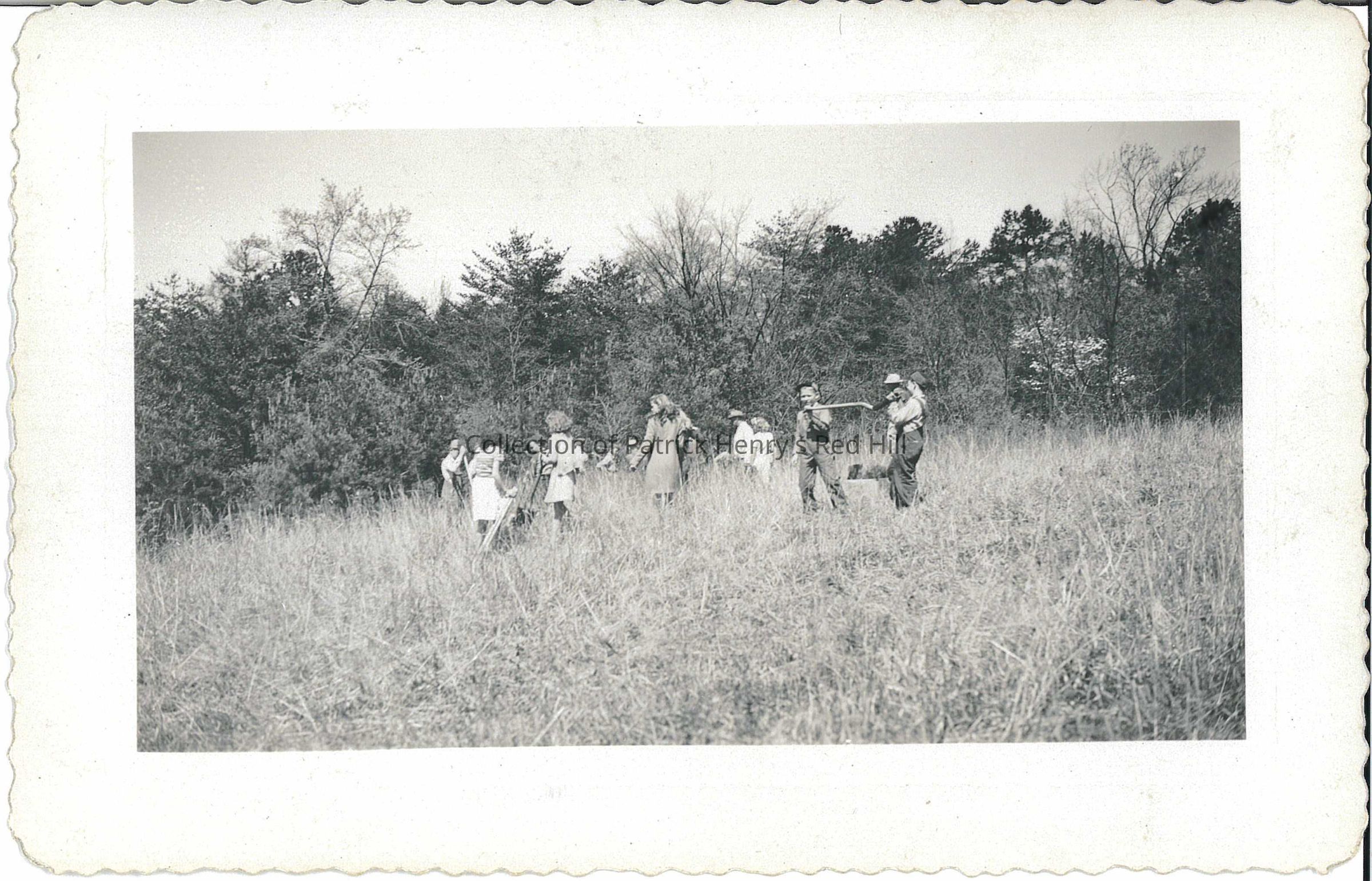This file contains black and white photographs taken during the Aspen School 4-H clean-up day at Red Hill. In April 1946, twelve 4-H children from Aspen came to work for the day cleaning up the brush and trimming the bushes near the Patrick Henry gravesite and the foundation of the house. Kermit Barbour, Assistant Charlotte County Extension Agent, worked with the 4-H Club and Major John Guthrie to arrange this work day. A local farmer drove the children in his truck to Red Hill. Some of the local children included in the clean-up day were Robert Lee Marshall, Donnie St. John, Geraldine Tucker Moore, Lois Barton Marshall, and Vivian Claybrook Foster. The children made a second trip a few weeks afterward to finish the job.