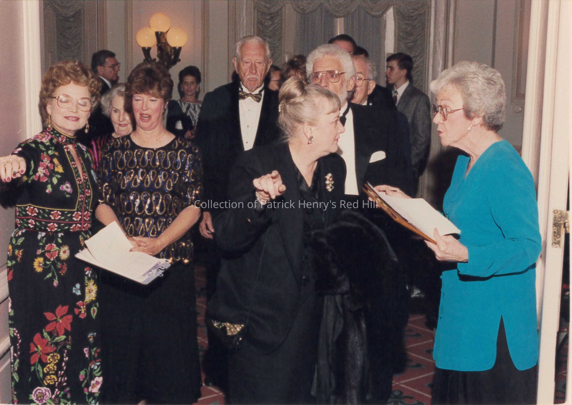 Mrs. Harriet Rice was on the PHMF board of trustees at the time of this event. Susan "Sue" Elson was the wife of James "Jim" M. Elson (1932–2021), the Executive Vice President of the PHMF at the time of this event. Michael Jesse Bennett (1929–2019) was a professional actor from Utah who also interpreted Patrick Henry for 30 years, which would earn him the George Washington Award from the Freedom Foundation at Valley Forge in 1996. Edith Poindexter (1928–2019) was deeply involved in Red Hill as genealogist, curator, and Patrick Henry researcher. She passed away in March 2019.