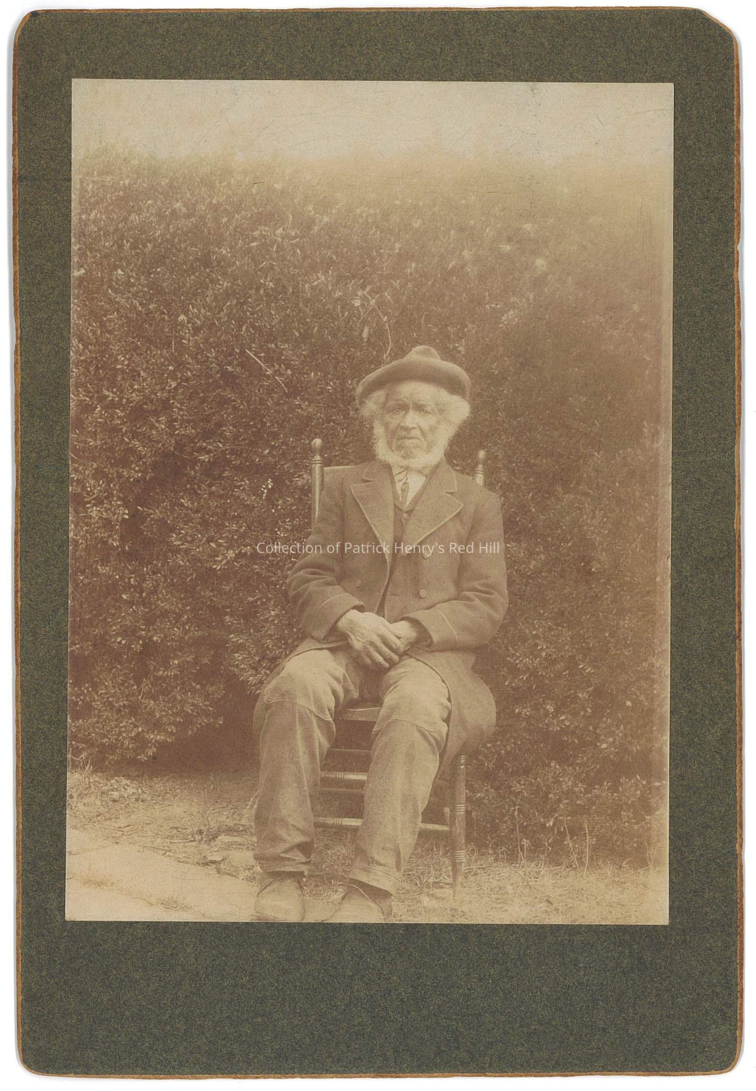 Harrison is seen here in his later years in the late 19th century. The image was taken at Red Hill in front of the boxwood hedges planted by John and Elvira McClelland Henry (1808-1875).