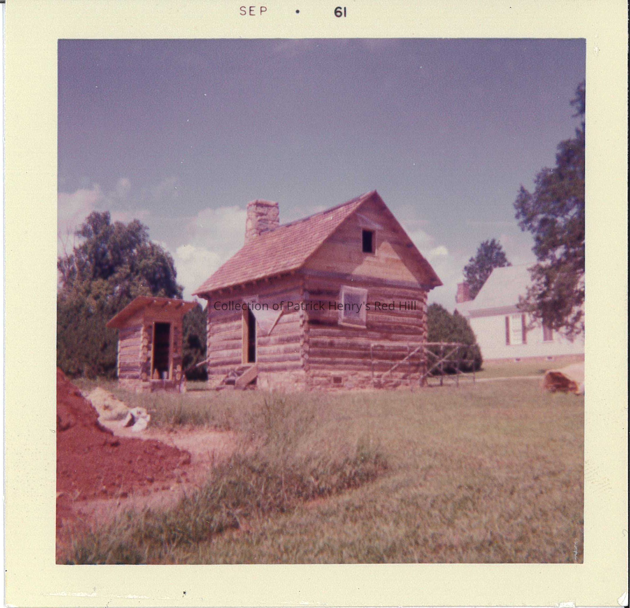 This particular photo was taken of Harrison's Cabin and the Slave Privy during construction in September 1961. The cabin was restored using approximately 25% of its logs from the original cabin built in the 19th century. The other 75% seem to have been taken from a barn.