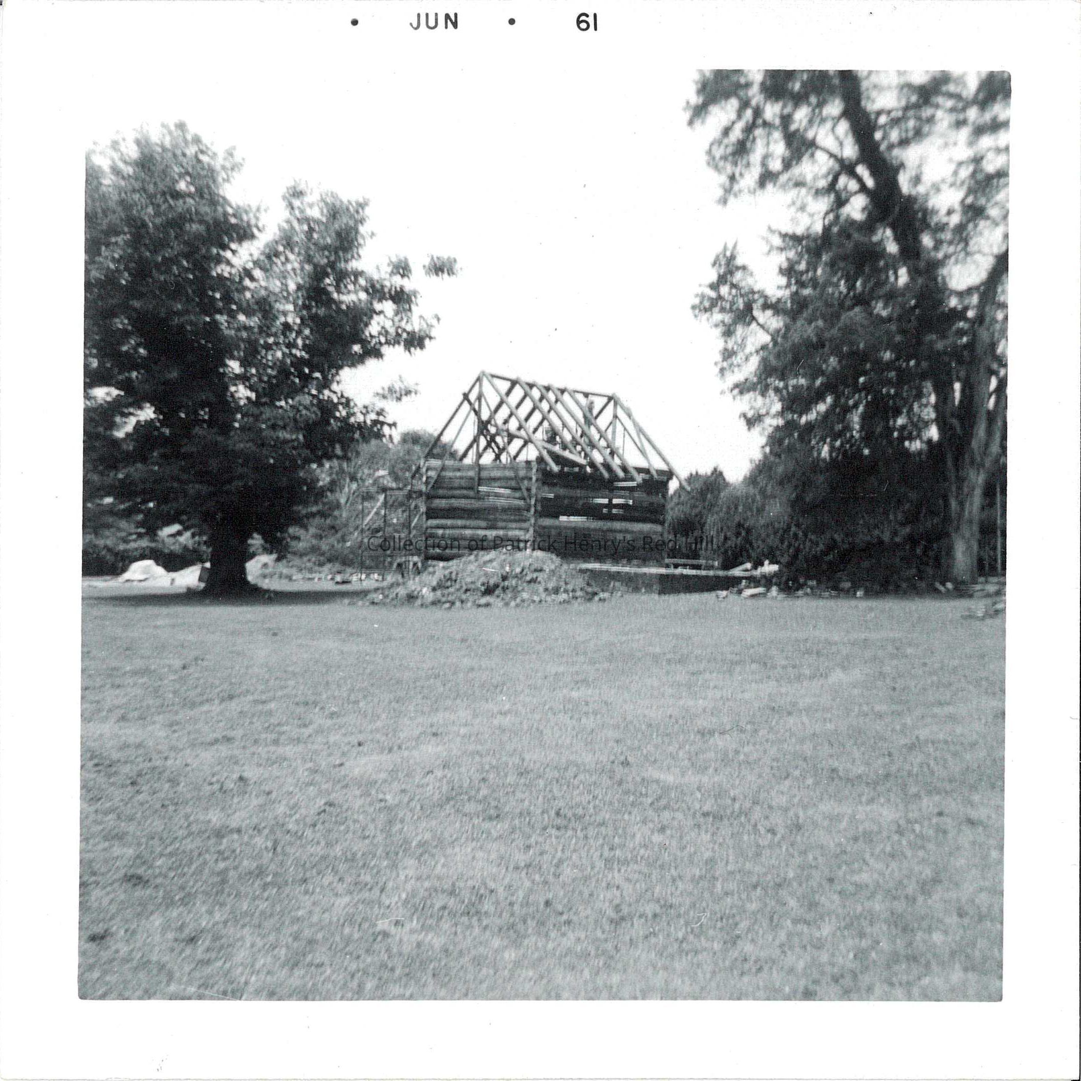 This particular photograph was taken of Harrison's Cabin and the icehouse during construction in June 1961. The cabin was restored using approximately 25% of its logs from the original cabin built in the 19th century. The other 75% seems to have been taken from a barn.