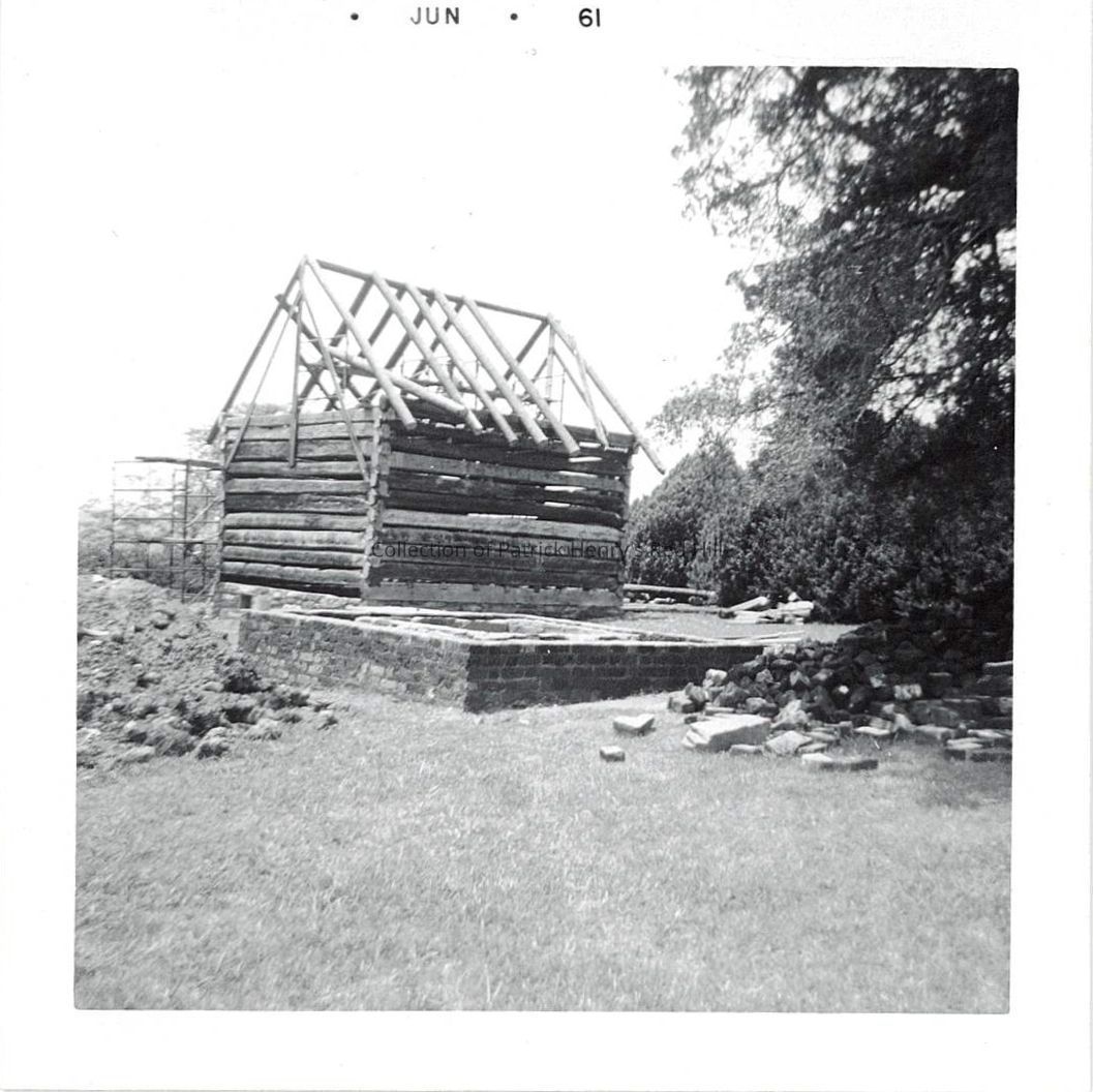 This particular photo was taken of Harrison's Cabin and the icehouse during construction in June 1961. The cabin was restored using approximately 25% of its logs from the original cabin built in the 19th century. The other 75% seem to have been taken from a barn ...